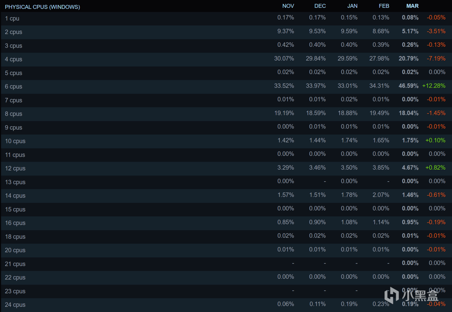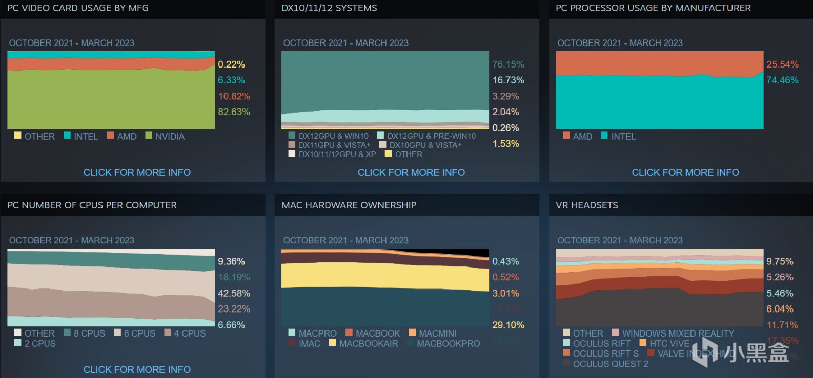 2023年3月,根據Steam在近1.35億用戶中的硬件調查中顯示,NVIDIA佔據了82.63%的份額,而AMD僅佔據了10.82%的份額,約2700萬用戶的顯卡支持DX12