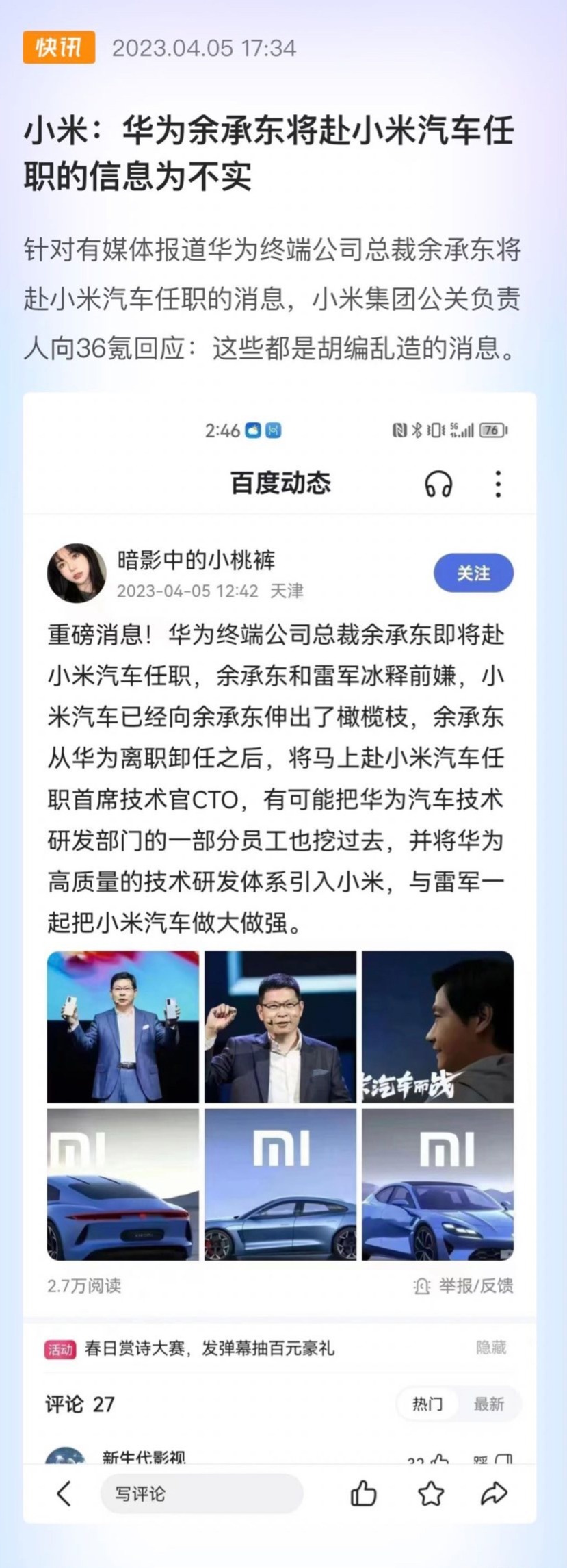 針對“華爲終端公司總裁餘承東將赴小米汽車任職”的消息,小米集團公關負責人向 36 氪回應稱: 這些都是胡編亂造的消息。