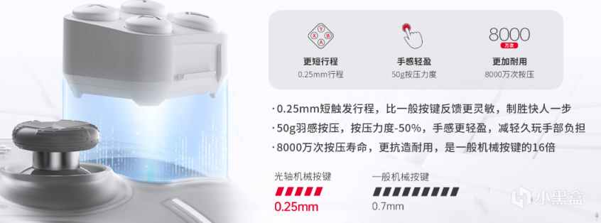 到了这次宙斯2铺天盖地的宣传重点——北通全球首发的光轴,一开始我还不以为然以为光轴是哗众取宠,用过之后确实扭转了印象,这光轴非常好按又省力,确实是市面上手柄最好按的按键之一。