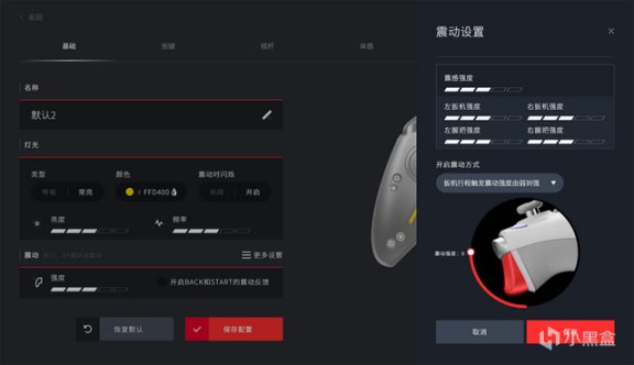 再说说宙斯2新加入的扳机震动,区别于手柄震动带来的整体快感,扳机震动更能带来更身临其境的反馈,比如在手动挡踩油门时不同按压深度带来不同的扳机震动,或者射击游戏不同枪械带来的射击反馈。经测试地平线5是完美适配不需调整的,如果有不适配扳机震动的游戏,可进入北通游戏厅调节扳机震动与握把震动,左右震感从弱到强各有5挡。