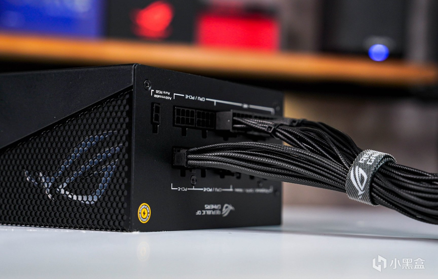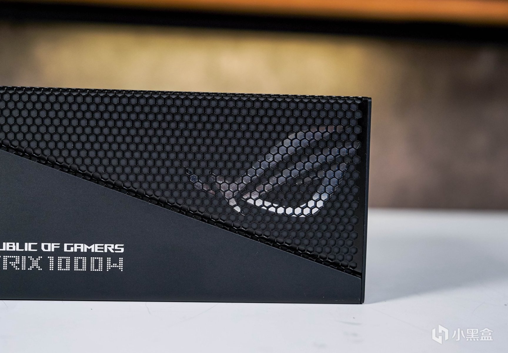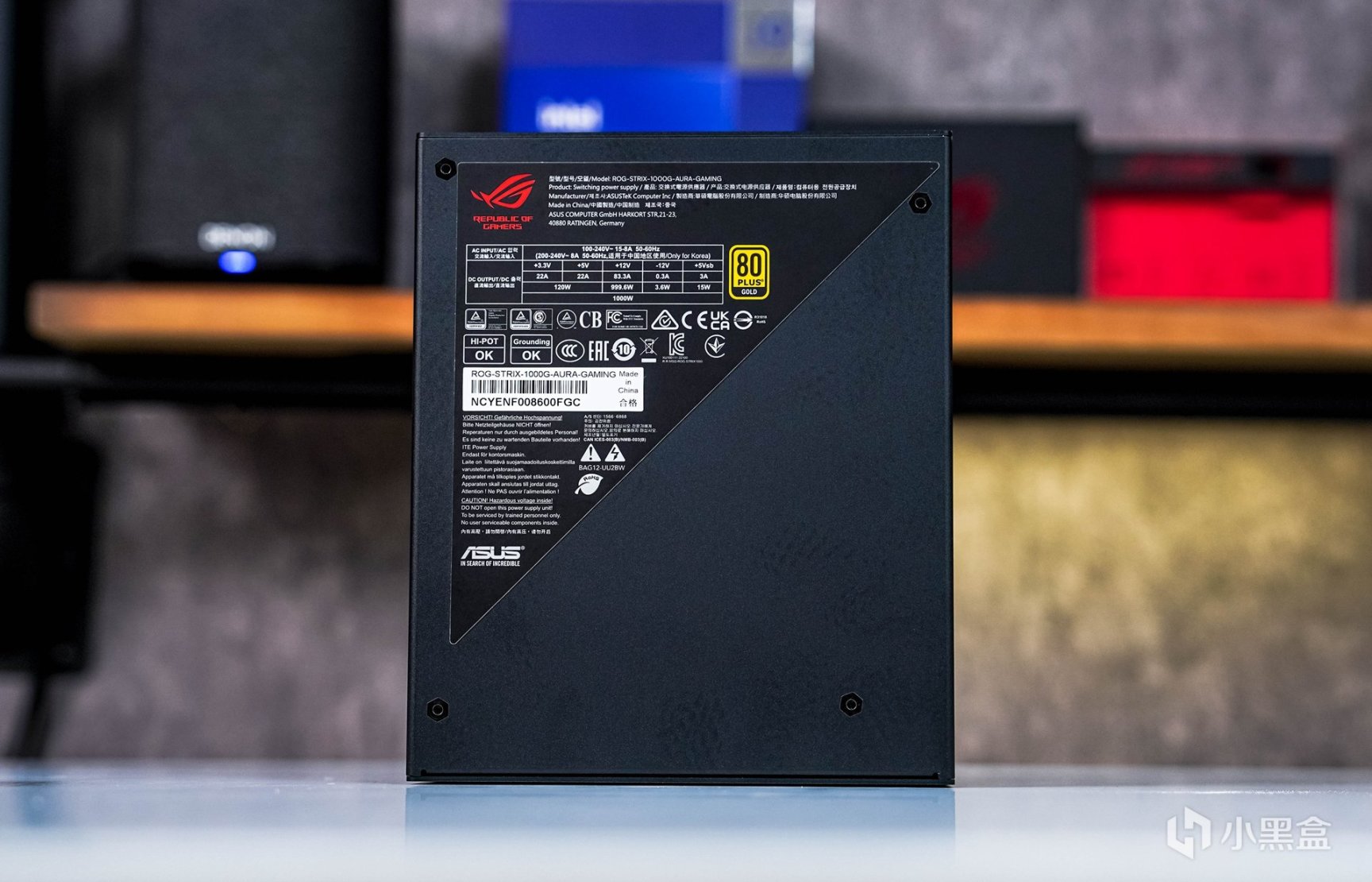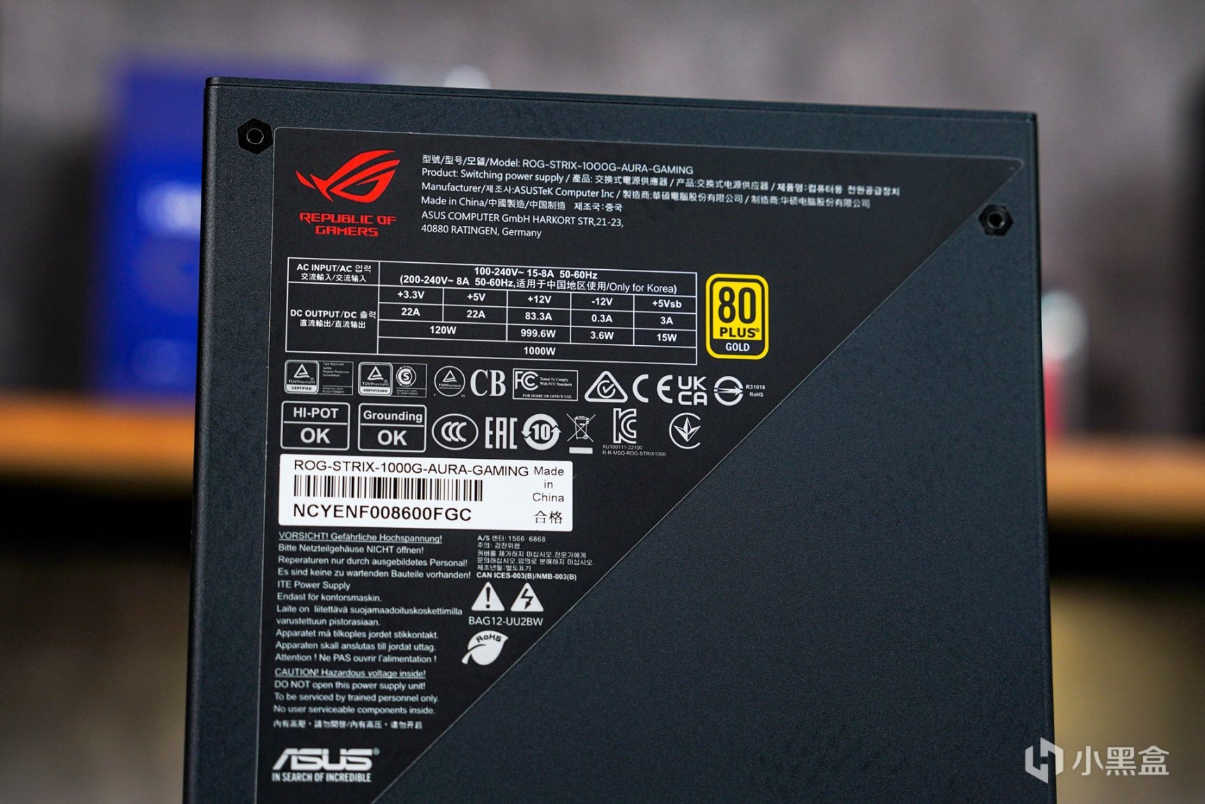 电源: ASUS ROG STRIX 雷鹰 AURA 1000W金牌全模组ATX3.0电源。可以看做上一代的升级版本。升级版的雷鹰电源整体尺寸为:180 x 150 x 86 mm,外观对比上一代又有了不少的变化,从左右分割设计改成上面分割设计,铝制外壳风扇侧为铝制黑丝网罩设计,让整体的设计流线条更有质感。