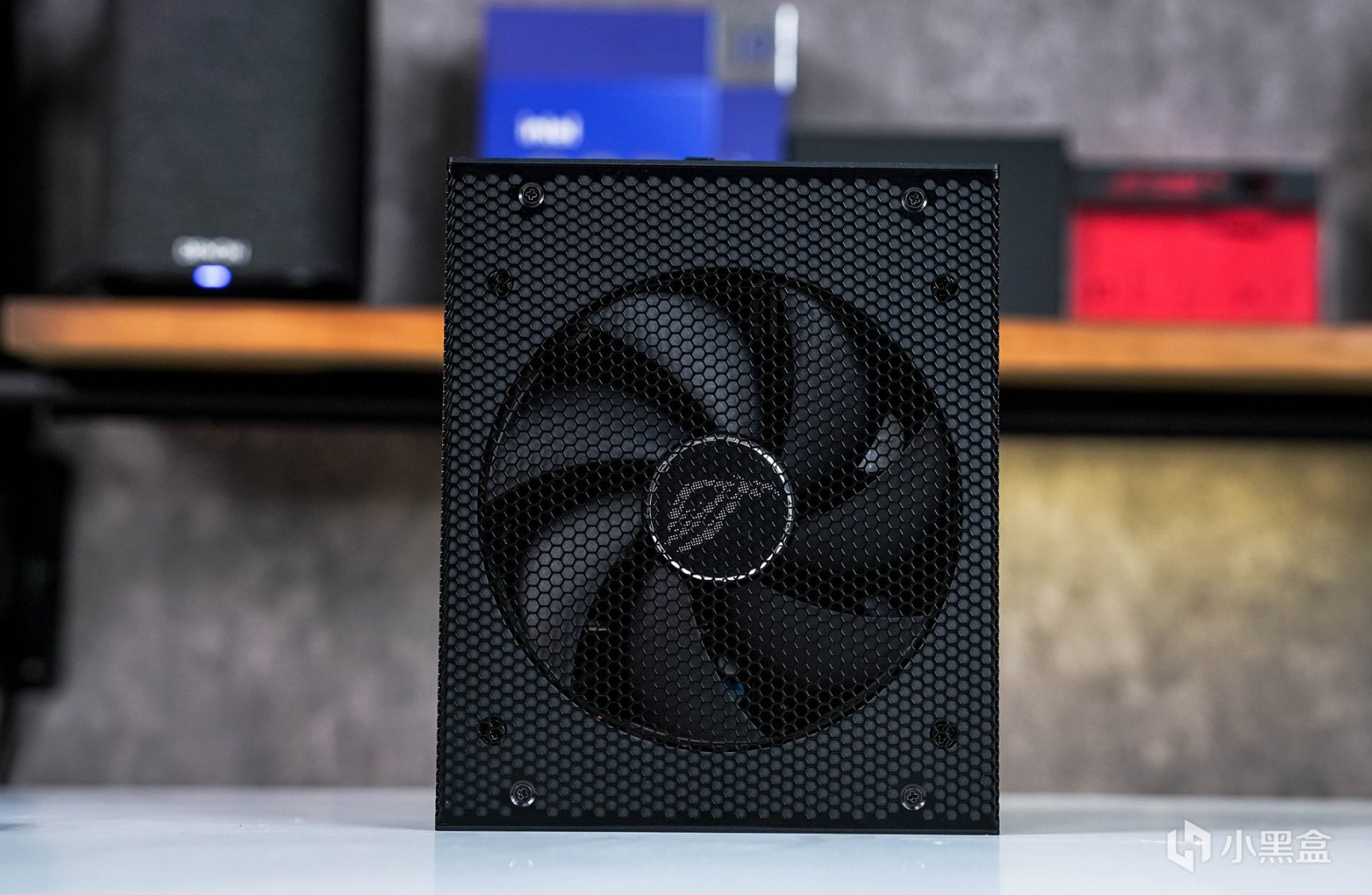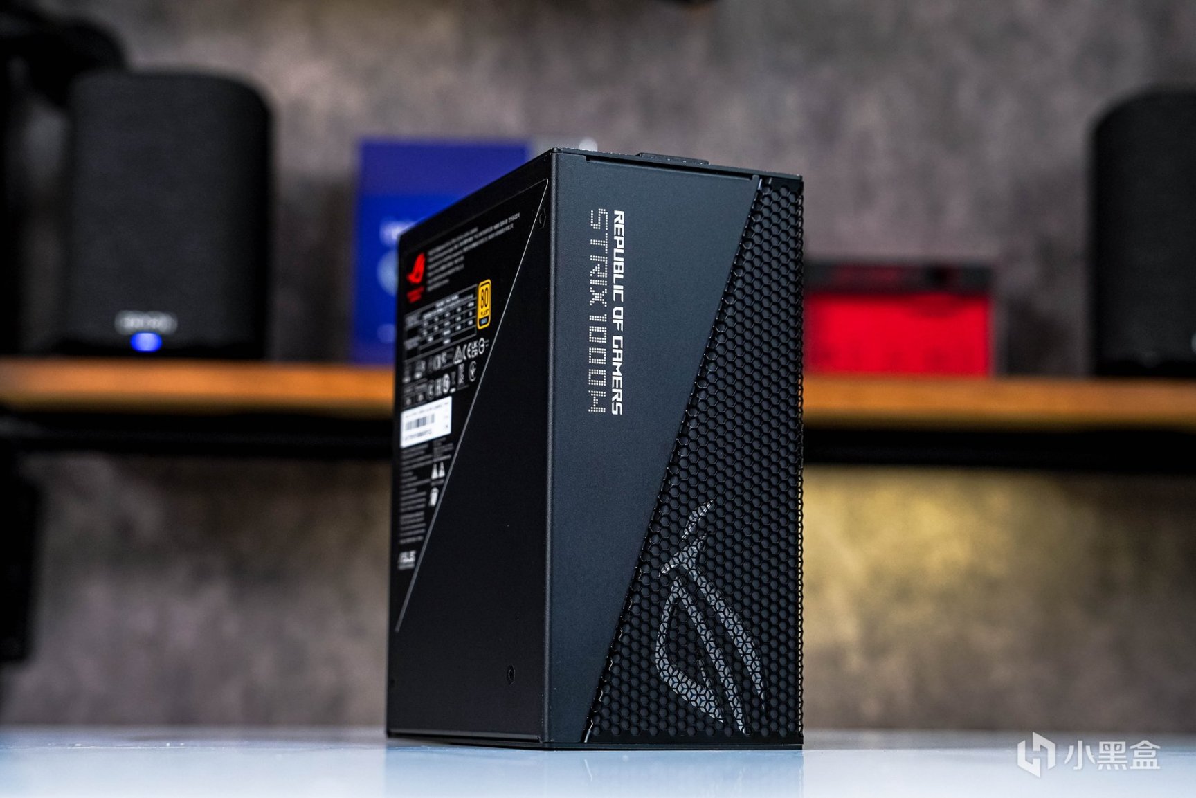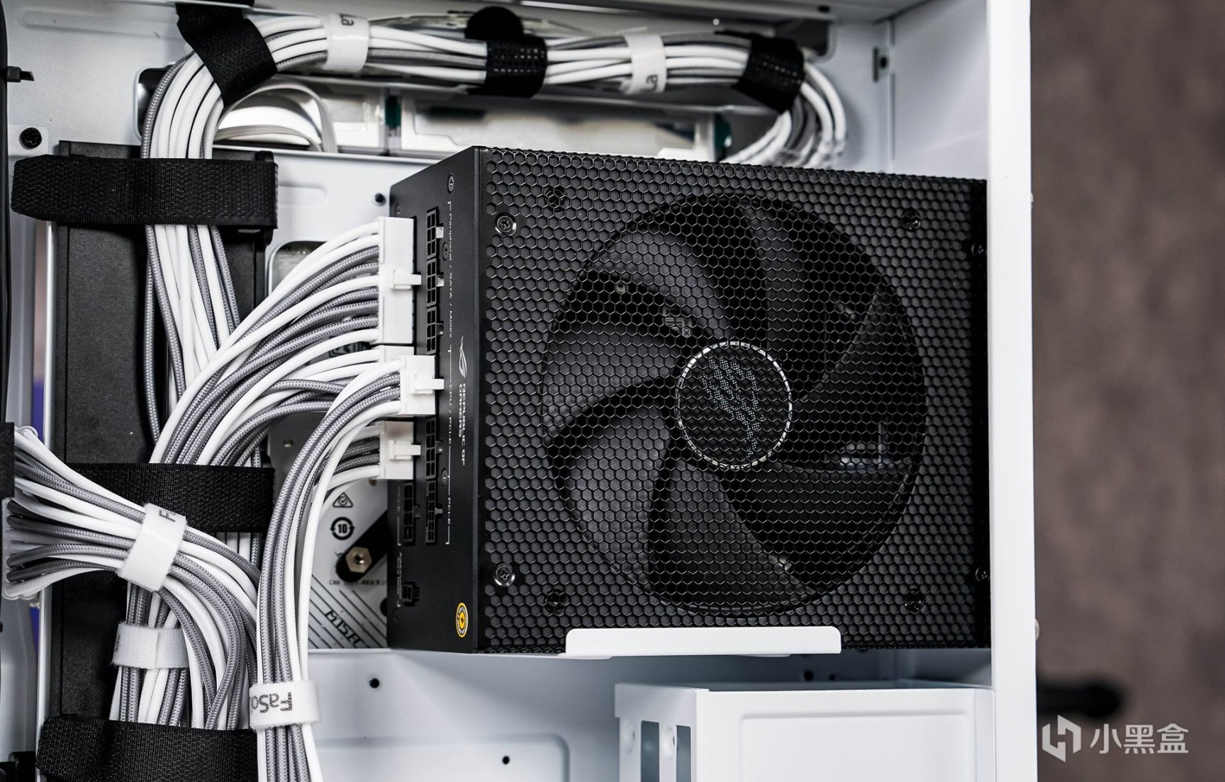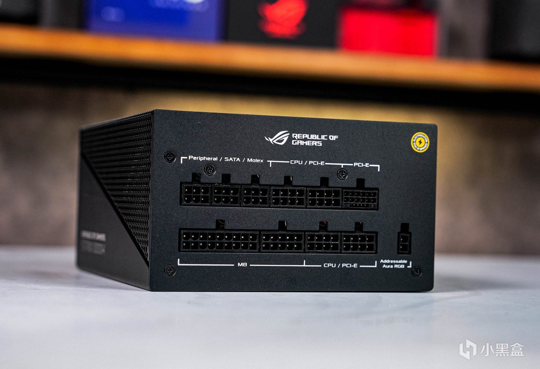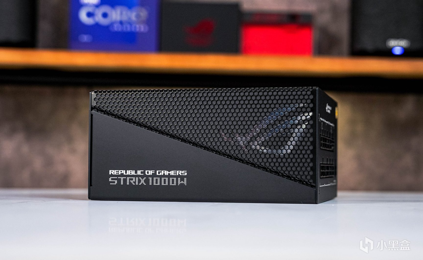 电源: ASUS ROG STRIX 雷鹰 AURA 1000W金牌全模组ATX3.0电源。可以看做上一代的升级版本。升级版的雷鹰电源整体尺寸为:180 x 150 x 86 mm,外观对比上一代又有了不少的变化,从左右分割设计改成上面分割设计,铝制外壳风扇侧为铝制黑丝网罩设计,让整体的设计流线条更有质感。