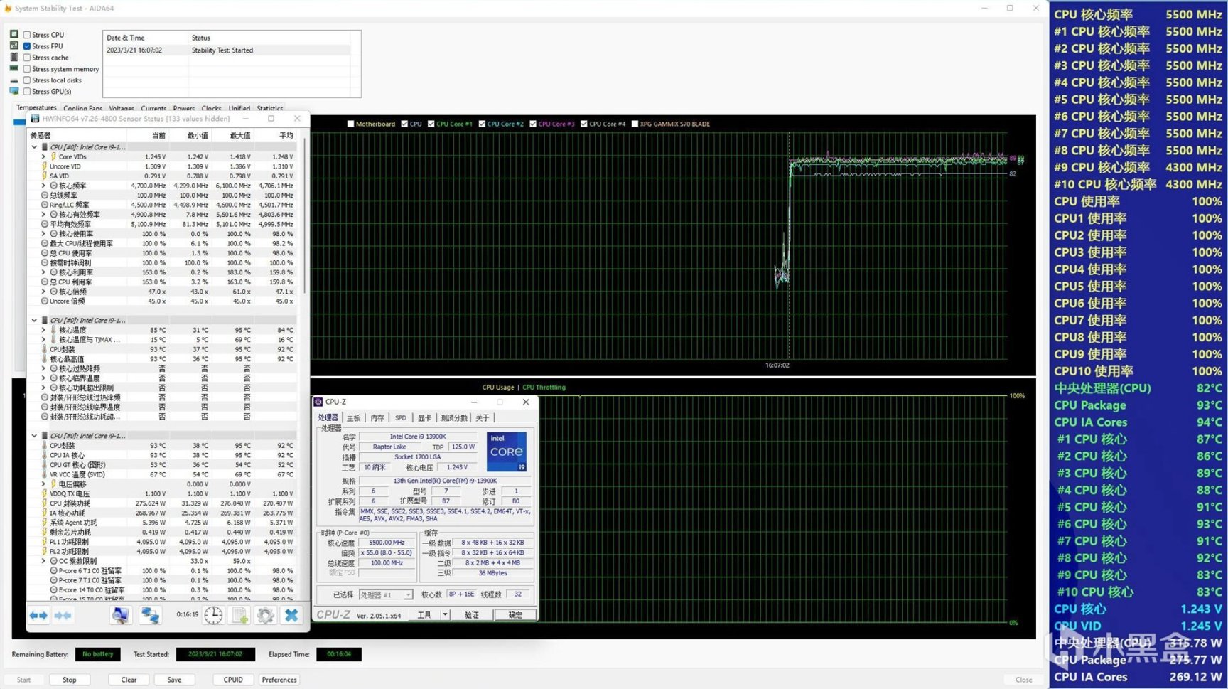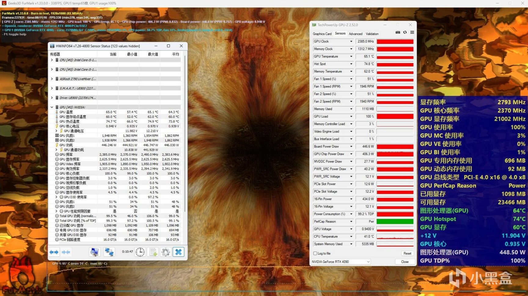 散热测试:室温26℃,湿度87%。FPU满载:最高瓦数可达到315W,P核5.5G,E核4.3G CPU温度维持在82℃,CPU核心温度93℃。GPU FurMark满载测试温度维持在65℃,HOT温度74℃,显存温度控制在62℃,实时功耗接近450W。而在运行时,整个主机的功耗达到870W左右。(实实在在的电老虎)