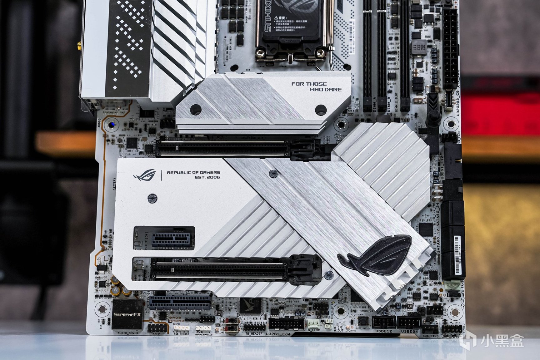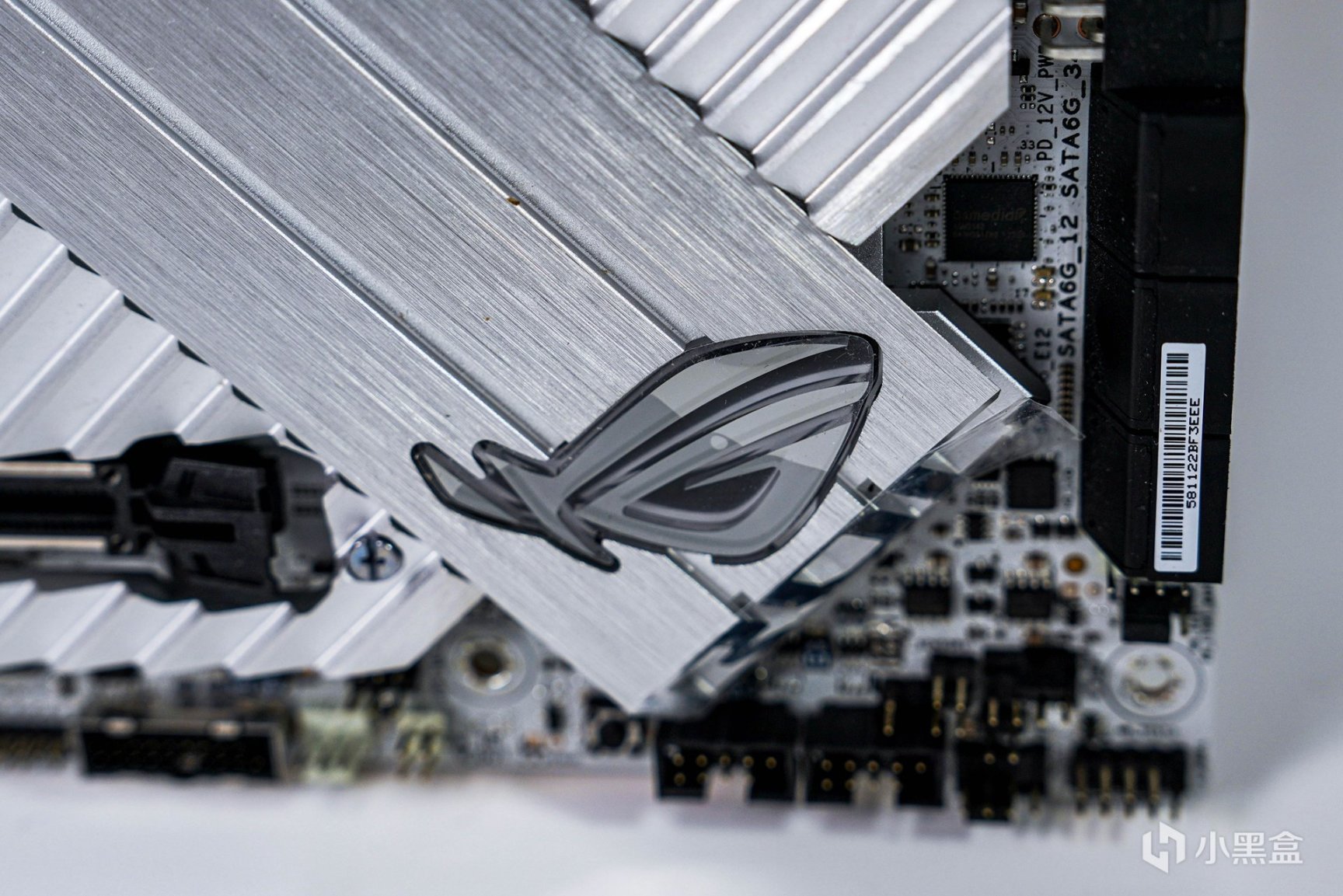 主板下半部份:采用全铝银色散热装甲,采用拉丝、磨砂、波浪纹三种不同的金属工艺结合,左侧散热片金属磨砂处理,右下主板芯片散热上方采用交叉斜纹设计,波浪纹和铝合金拉丝的艺术组合,右侧是 ROG 败家之眼 Logo,附带 RGB 灯效,末端斜切面为镂空的 ROG 高光字母设计。在细节设计上ROG主板的信仰标准是直接拉满。