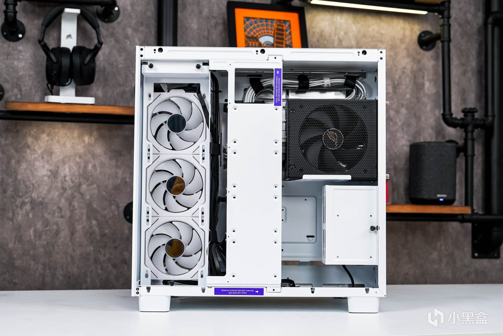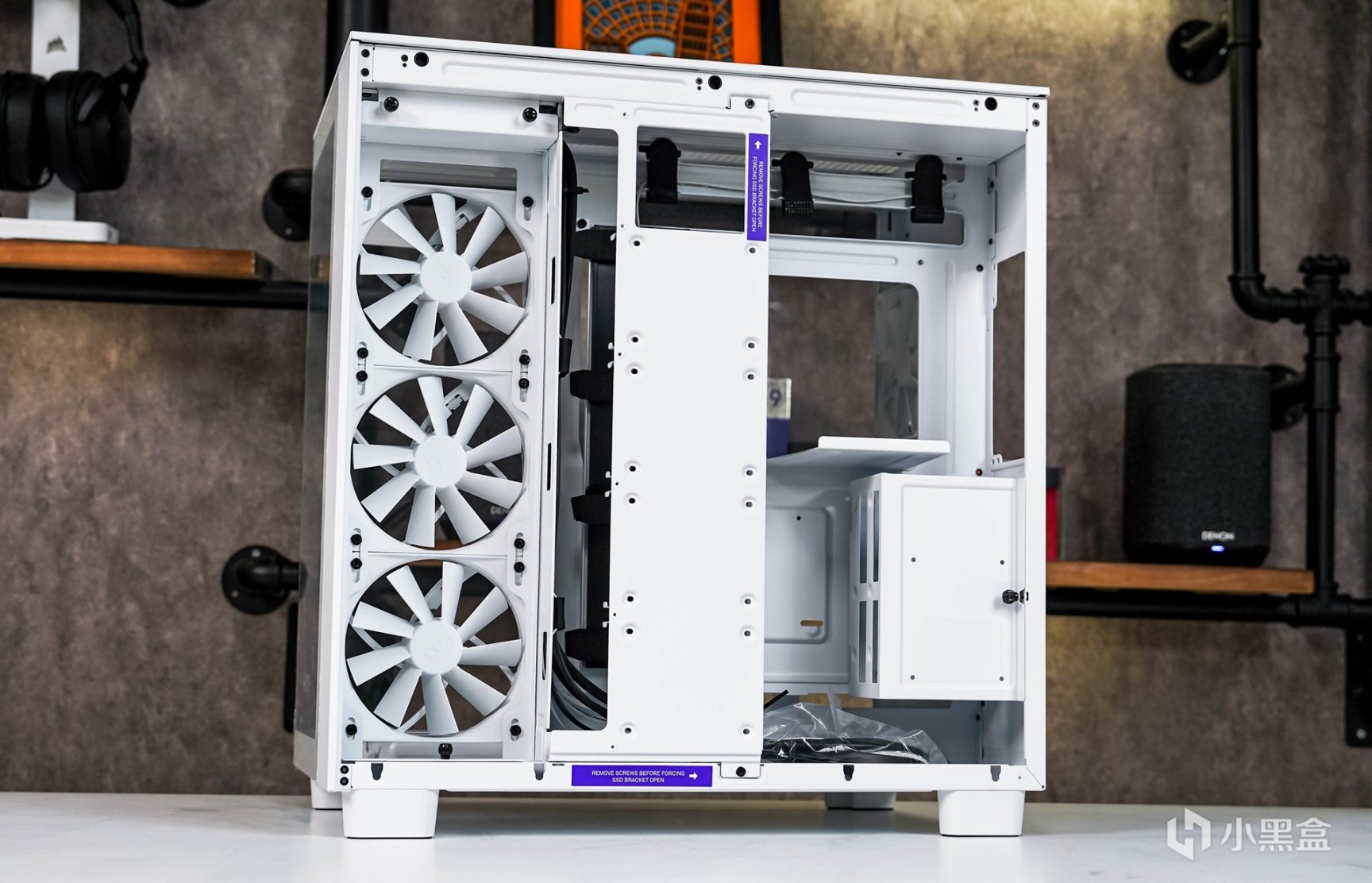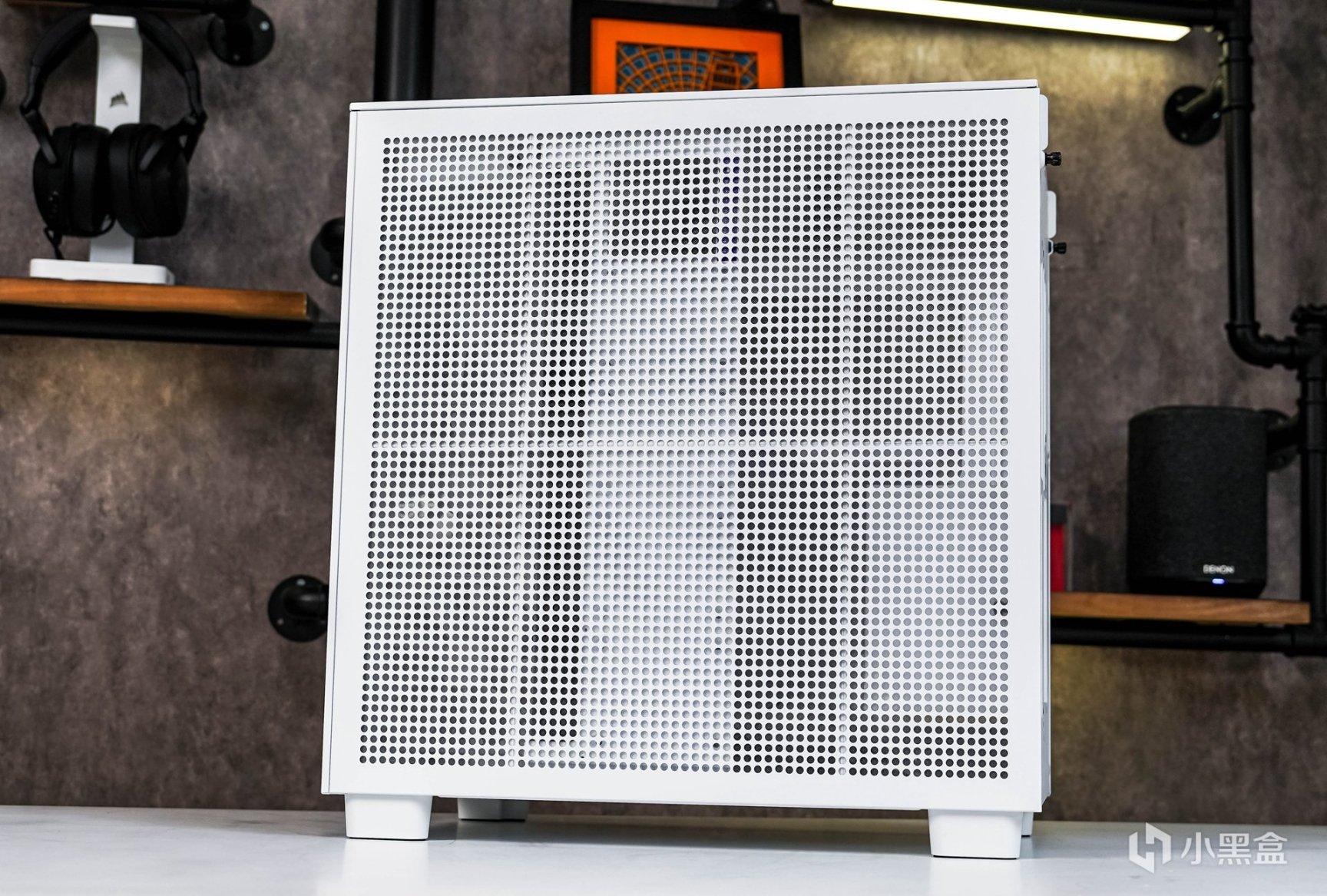 双腔机箱的最大的优势就是安装硬件时拥有着非常舒服的安装体验,拆掉面板后,整个箱体的安装位置都是预设好的了。尺寸:466*290*495mm(长*宽*高),对比市面上同架构的箱型,H9 Flow的箱体较大。箱体前置面使用上了三角形支撑稳固原理来设计,有着稳固、坚定、耐压的特点。去掉一根柱体,让这个机箱真正的成为无遮挡的全景式机箱。