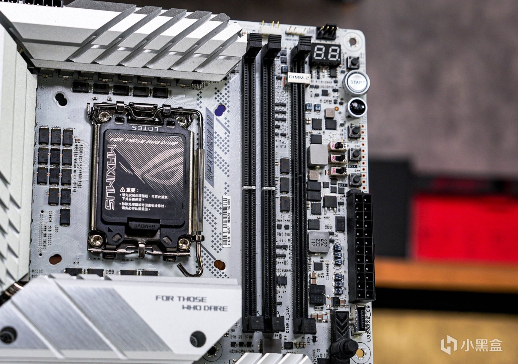 主板本体外观设计颠覆了以往的ROG家族以纯黑主色调,采用了让玩家期盼已久的金属银色散热装甲+白色PCB的搭配,相比于吹雪系主板来说,Z790 APEX的PCB设计拥有吸引力更强的纯白视觉设计焦点,对于喜欢超频和颜值向的白色主体高端装机的玩家是一款真正意义上纯白PCB的纯血ROG系主板。