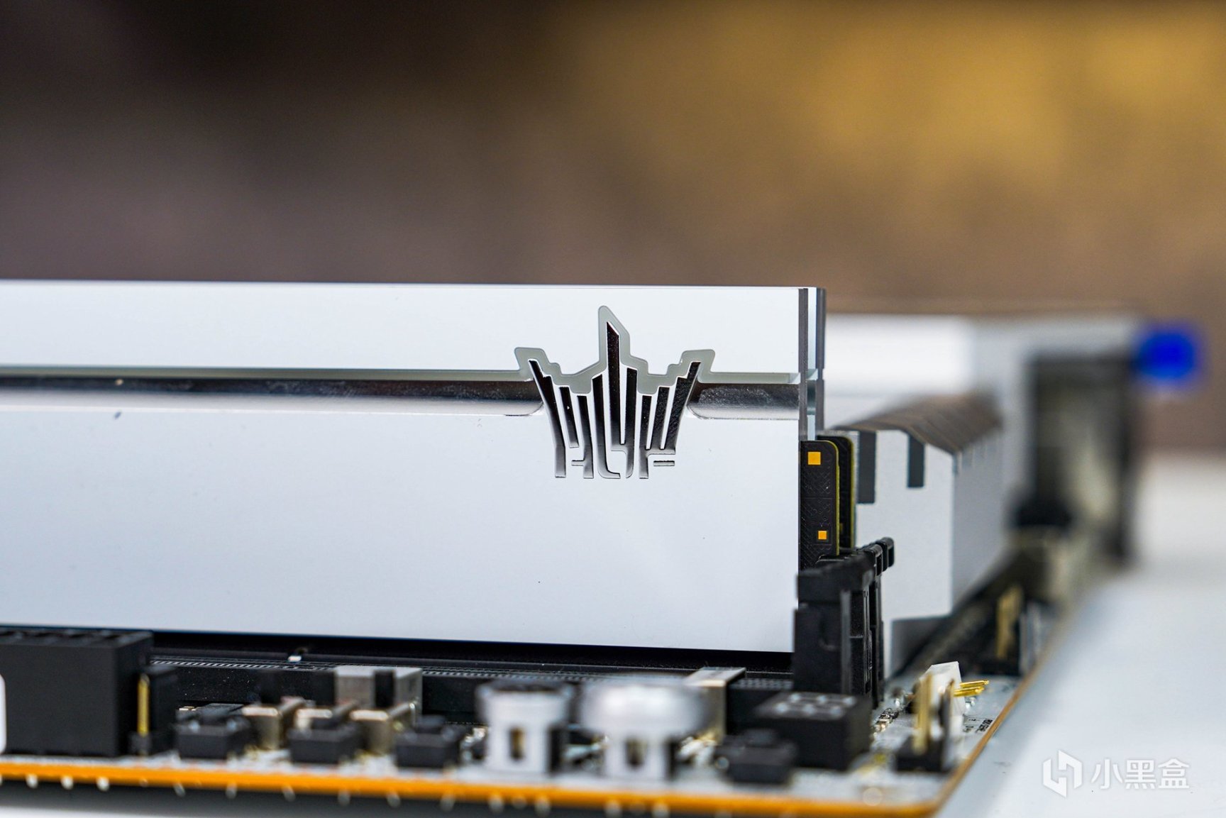 和以往影驰的旗舰内存设计不一样的是,这款HOF Pro DDR5采用全新造型设计,整体比较四四方方,PCB则采用10层加厚的散热片,并且在马甲前端有亮银 HOF“名人堂”皇冠造型,顶端导光区域和皇冠上端部分是RGB 灯效装饰,让整个LOGO在不同光线角度下都能完美呈现。