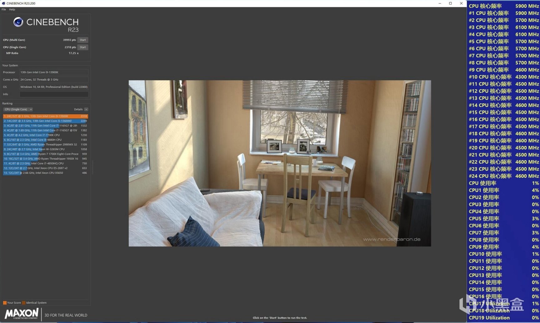 Cinebench R23 多核和单核成绩:39993 pts /2318 pts MP Ratio17.25 x 。