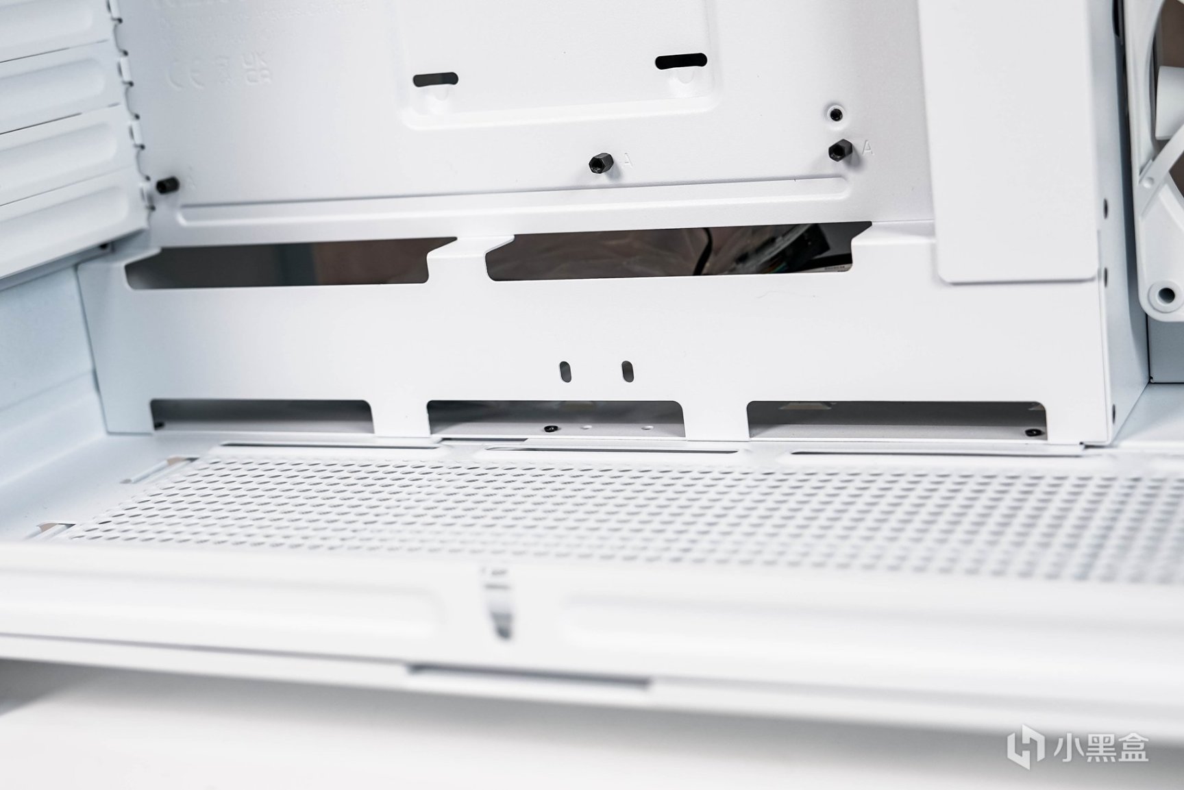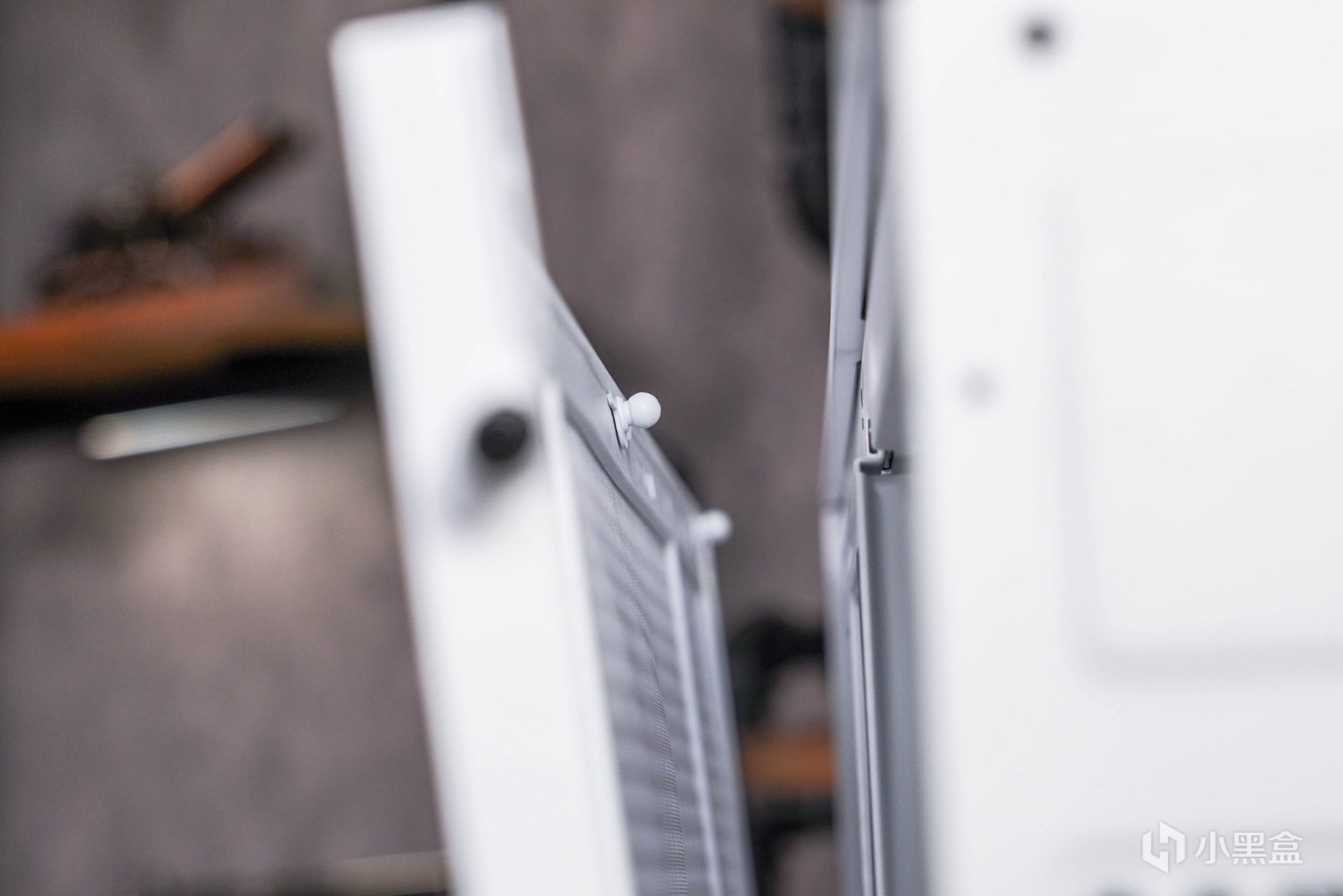 还有就是除了拥有高颜值的设计之外,在细节上也是满足了不少细节控的要求。比如:三重稳固设计完成,上面是弹扣设计,下面是凹孔卡扣和末端的防丢螺丝固定。背线开孔方面则由多层的加长开孔组合设计来完成,这样让背线的布置更为灵活。机箱多处均设有绑线锚点,可以满足不同背线藏线需求。