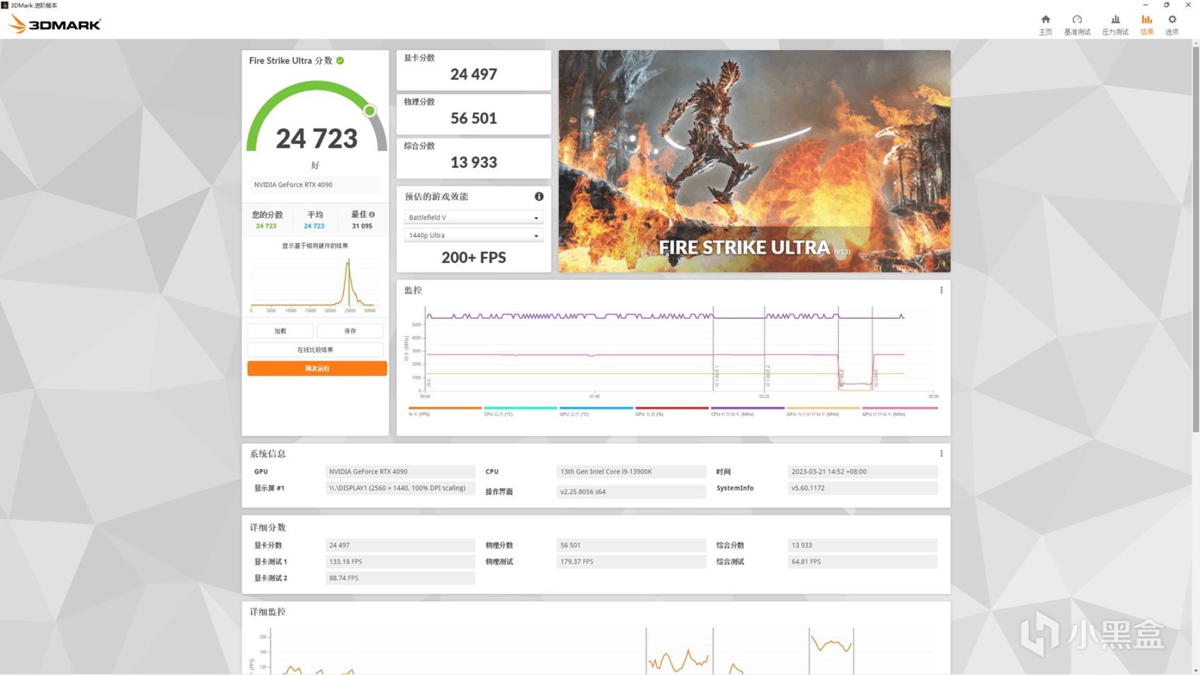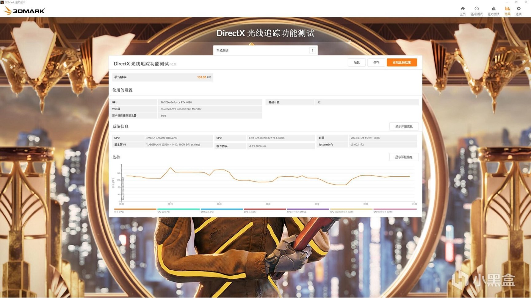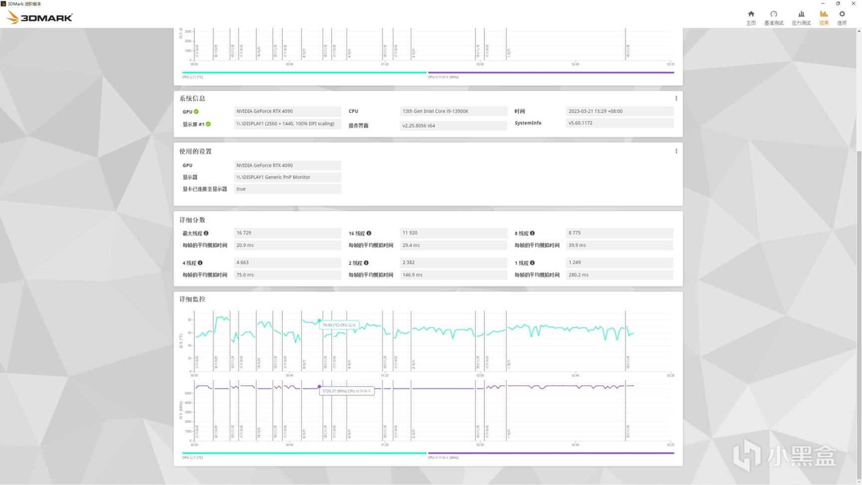 3D MARK CPU Profile 在默认状态下,获得的是i9 13900K综合所有可用线程的测试得分,成绩左侧则是CPU基本信息,下方是测试过程中的监控信息,有温度及CPU频率可供参考。