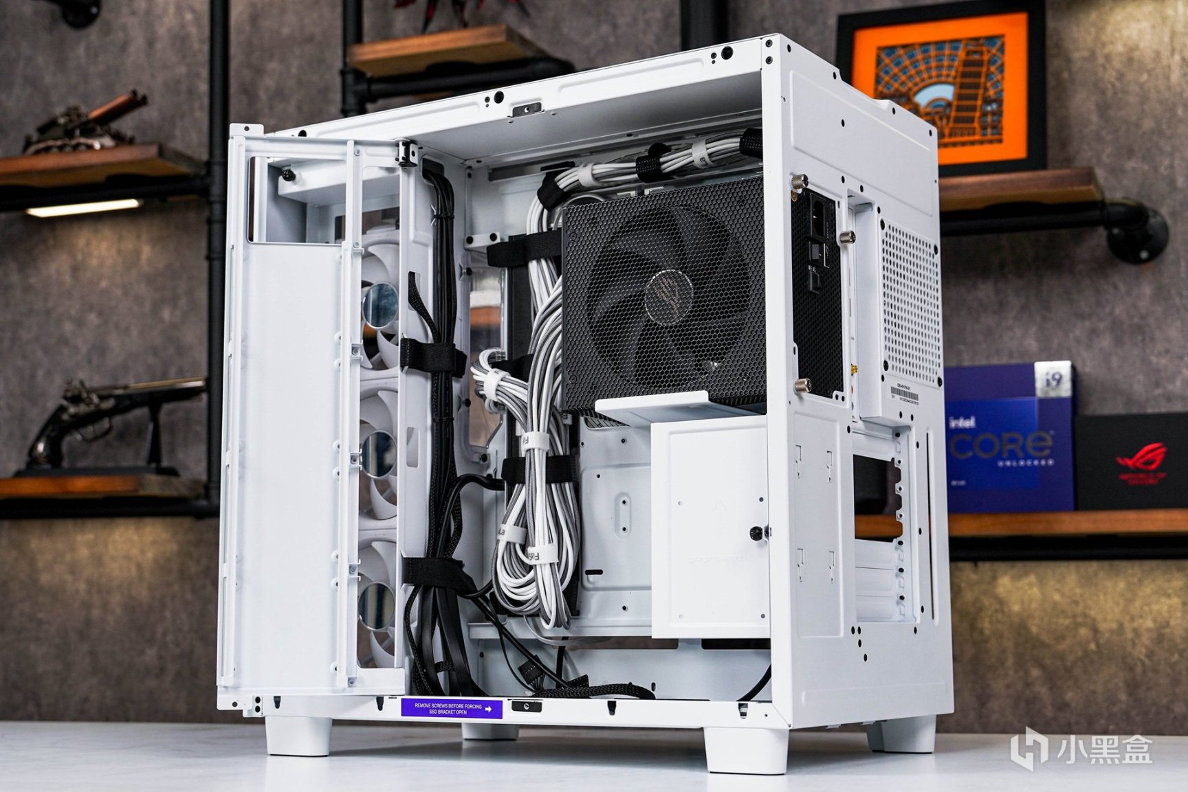 背线空间是充足的,布置背线应该不算太难。电源的兼容200MM长度,180MM长度的ASUS ROG STRIX 雷鹰 AURA 1000W安装进去是非常轻松的。关闭理线挡板后,机箱背线就可以完全遮挡,让背舱更为整洁。