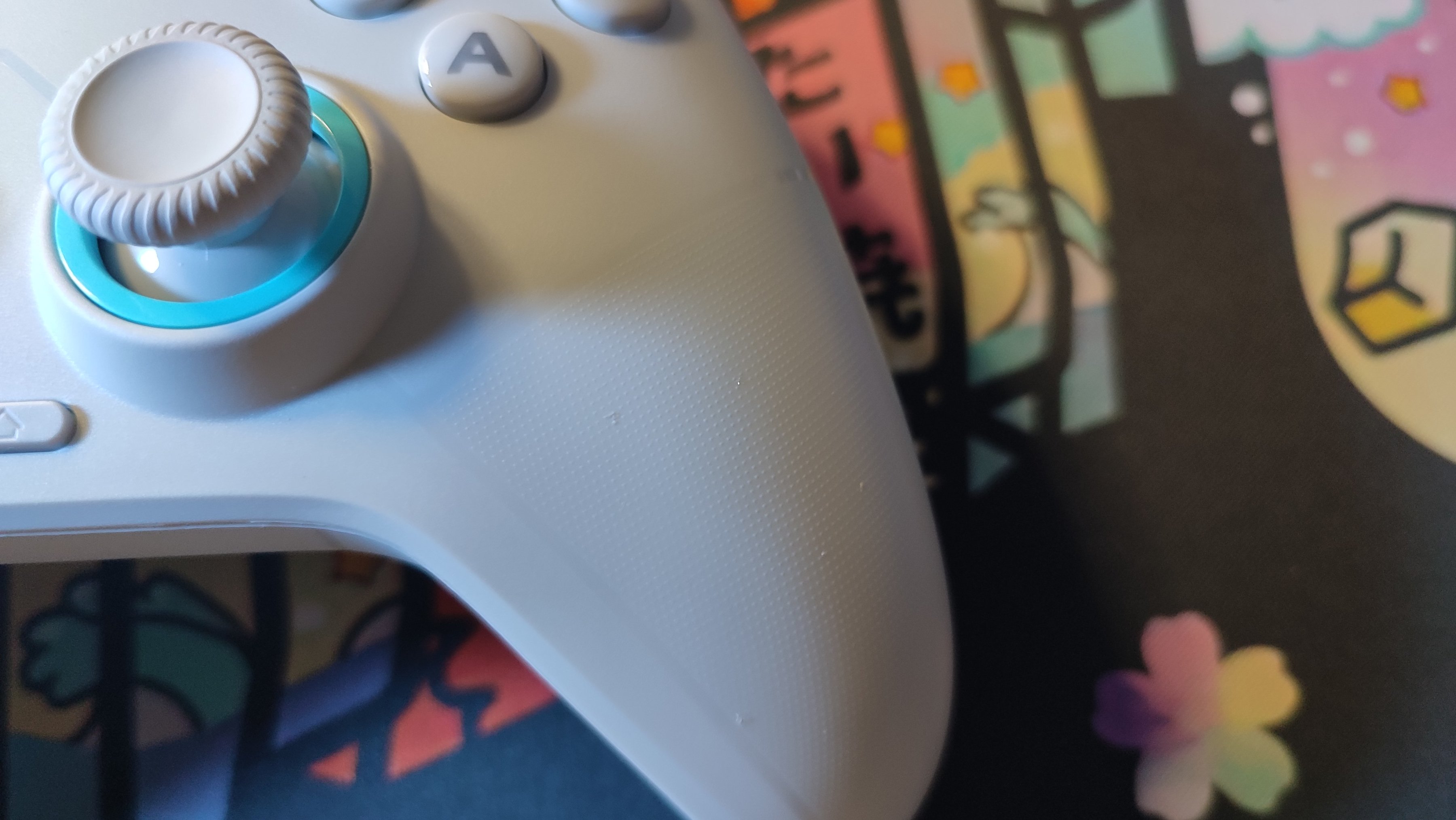 手柄通體均爲灰白色,而爲數不多的異色色彩均在正面,也就是搖桿周圍的一圈藍色部分。而廠商不可能只是爲了做一圈顏色進行搭配,肯定會有其特殊的作用。其實這一圈是由pom材料構成的,相信看過我之前文章的盒友應該很熟悉這種材料的特性了,沒錯,就是自潤滑。pom材質可以在日常使用中進行自潤滑,所以在使用這款手柄的時候,可能在一開始會感覺把搖桿推到底後旋轉起來有點沙沙的感覺,但是在使用一段時間後會發現很順暢,這其實就是搖桿周圍的這一圈pom材質的功勞。同時也可以做到抗磨損的作用,防止日常使用時搖桿產生磨損掉粉導致漂移。