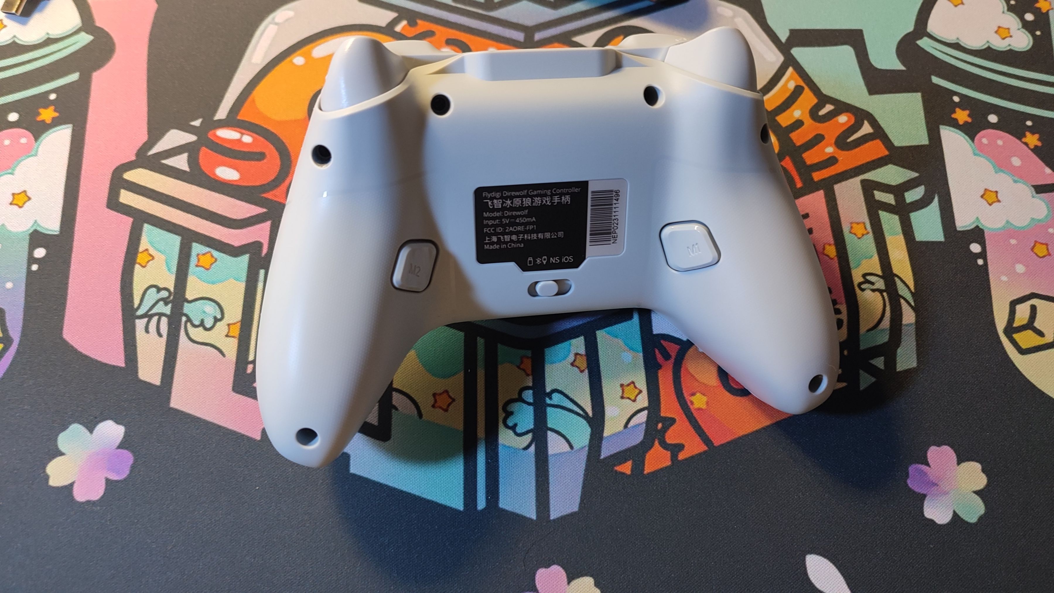 背面的東西就遠沒有正面那麼豐富了,首先看到的就是左右兩顆碩大的背鍵,支持映射按鍵或者錄製宏。中間則是模式切換開關,支持2.4G/藍牙有線/ns/iOS四個模式切換。
