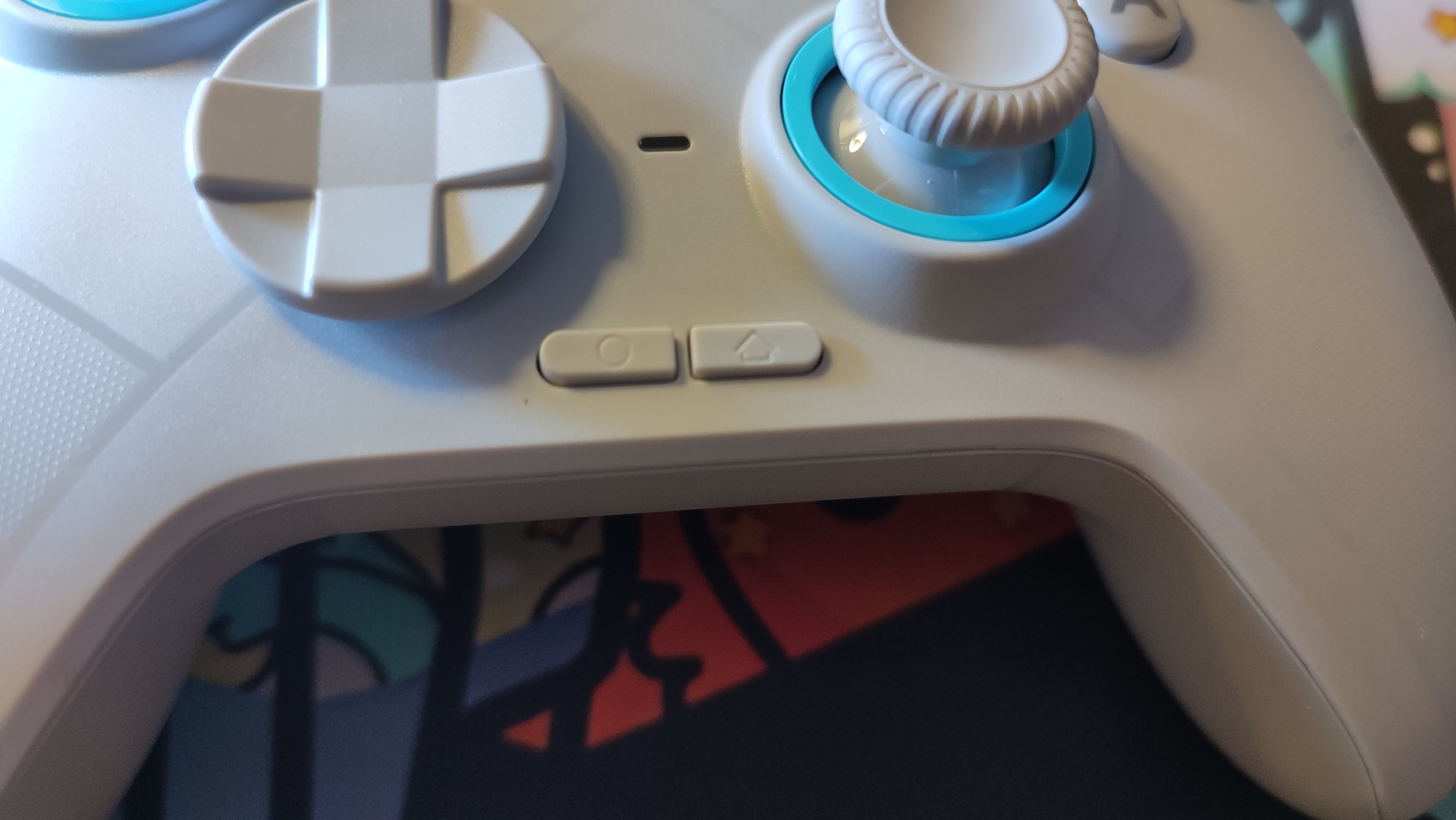 最下方則是冰原狼獨特的兩顆功能按鍵。手中有Switch的盒友想必一眼就能看出這兩顆按鍵的功能:截圖以及回到主頁。而這也剛好是該手柄在ns模式中的功能,我手中的另一款兼容ns的手柄沒有這兩顆按鍵,導致每次我玩遊戲時有些許折磨,而冰原狼將這兩顆按鍵添加到手柄正面,就可以在遊玩Switch的時候不會額外去原裝手柄上按這兩顆按鍵了。