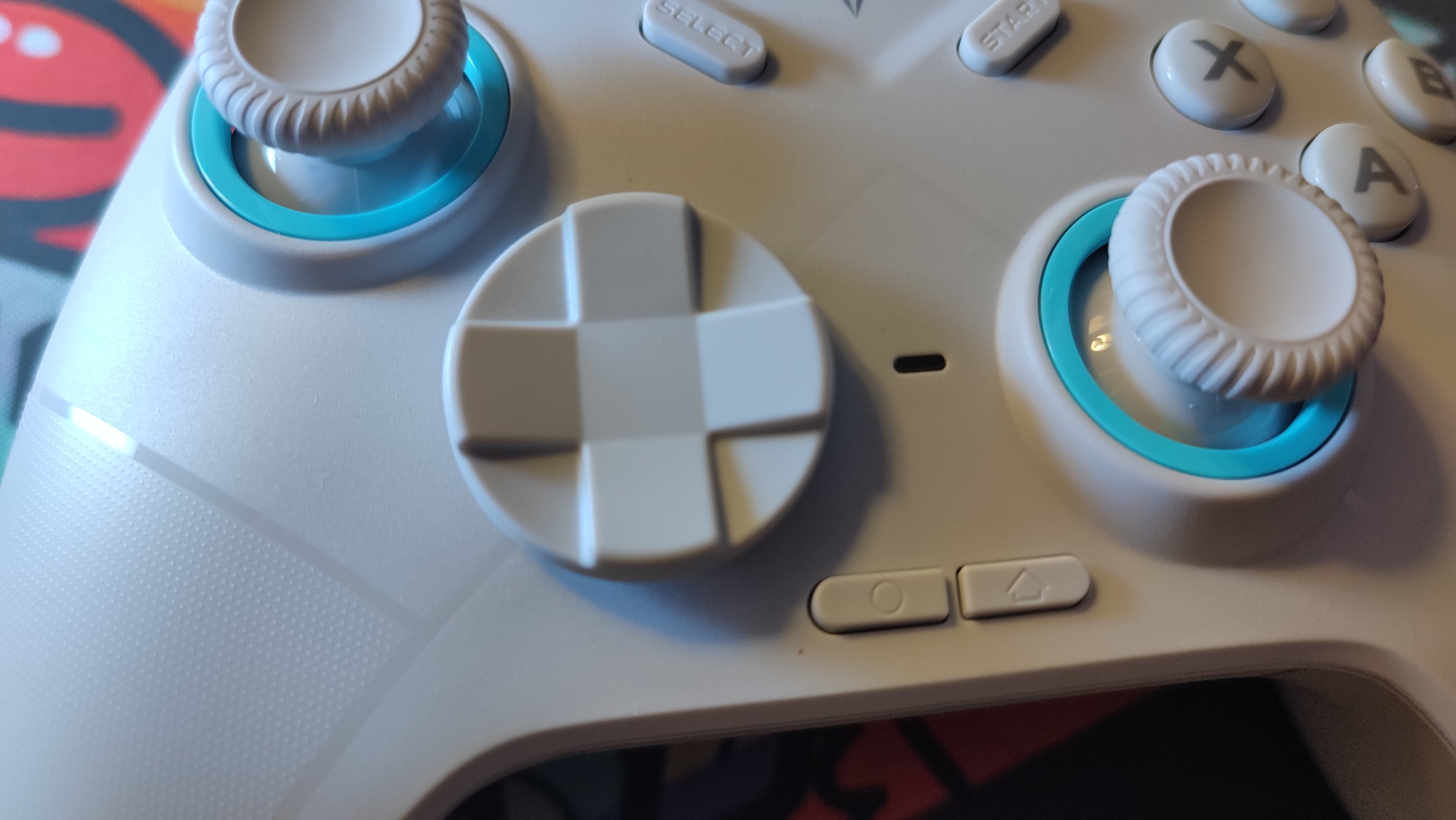 手柄左下就是十字鍵的位置了。不同於Xbox one手柄的設計,冰原狼的十字鍵將空白區域也利用了起來,形成了一個圓形。但是也不同於360手柄的那種設計,上手操作起來手感更像是兩種的結合體。這種設計的好處是在遊玩格鬥遊戲的時候搓招手感更好,方便精確輸出左下、右下之類的指令。