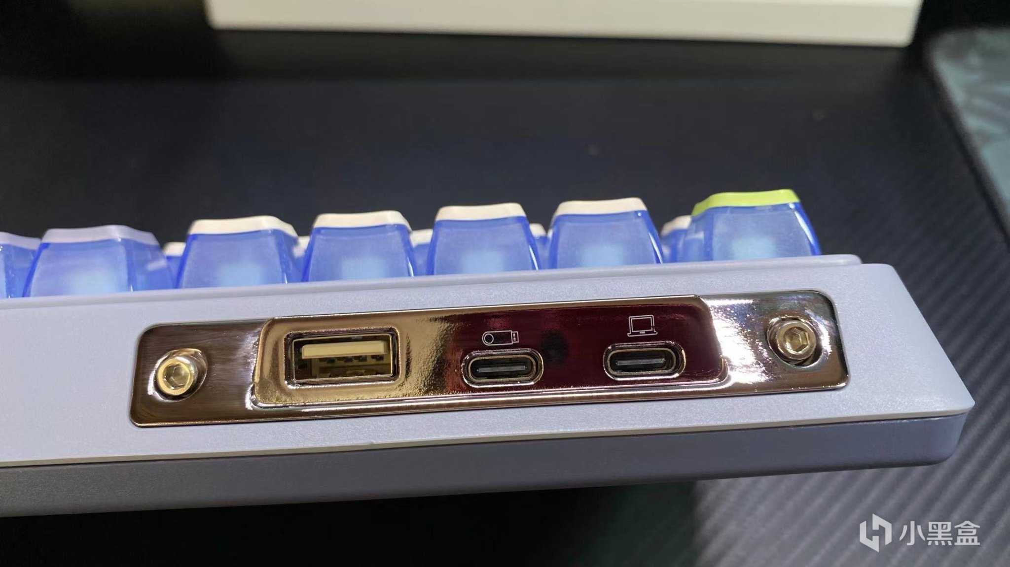 鍵盤的左上方有一個充電口以及兩個hub拓展口也就是說我可以一邊打遊戲,一遍用數據線連着鍵盤給手機充電(但是僅限於鍵盤連接數據線的情況下)在未連接充電線的情況下,並不能給手機充電。
