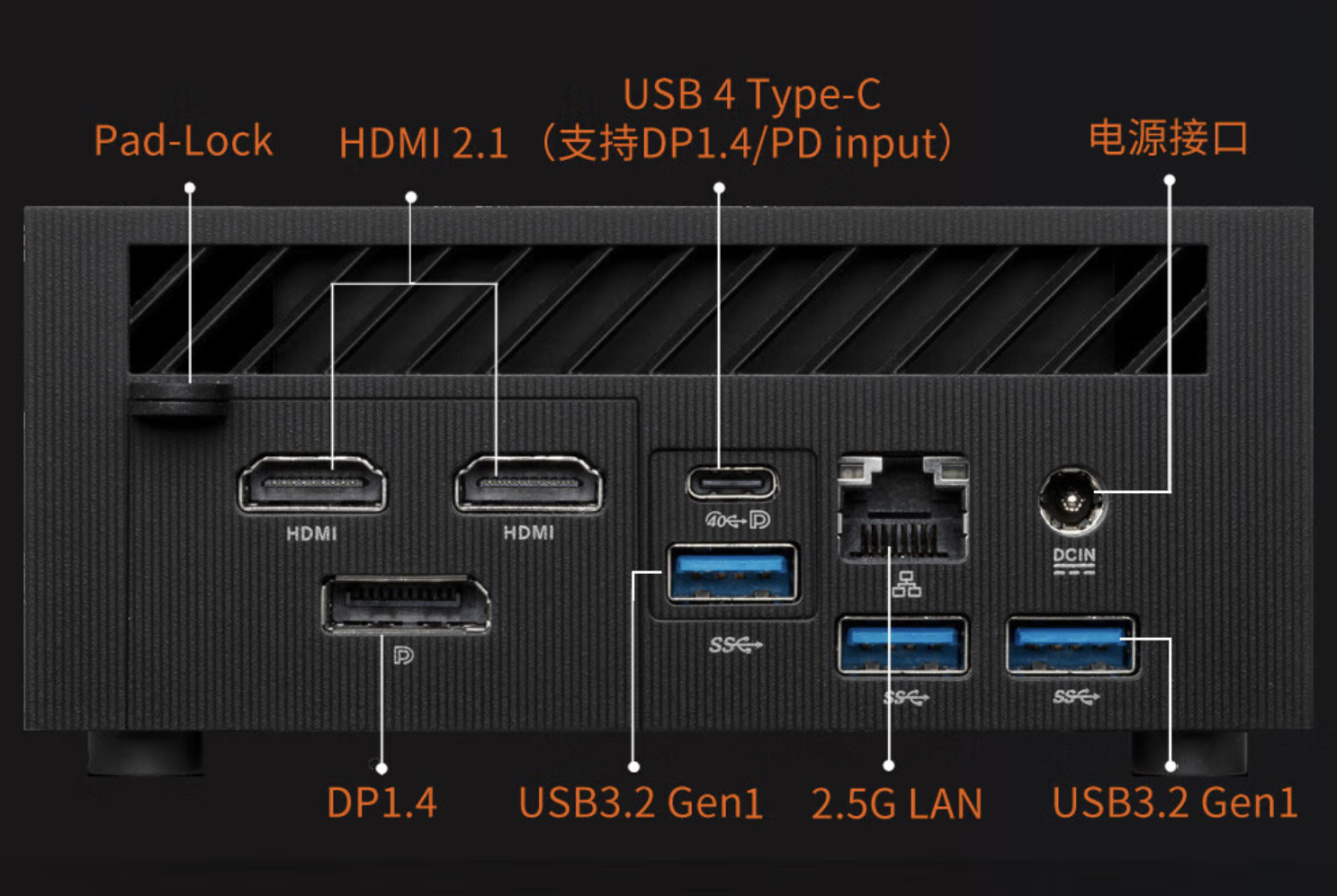 华硕PN53不仅支持4屏*4K显示还能够实现8K视界,2个HDMI 2.1端口支持4K@60Hz和8K@30Hz,USB 4 Type-C端口和DP 1.4端口支持5K@60Hz和8K@30Hz。