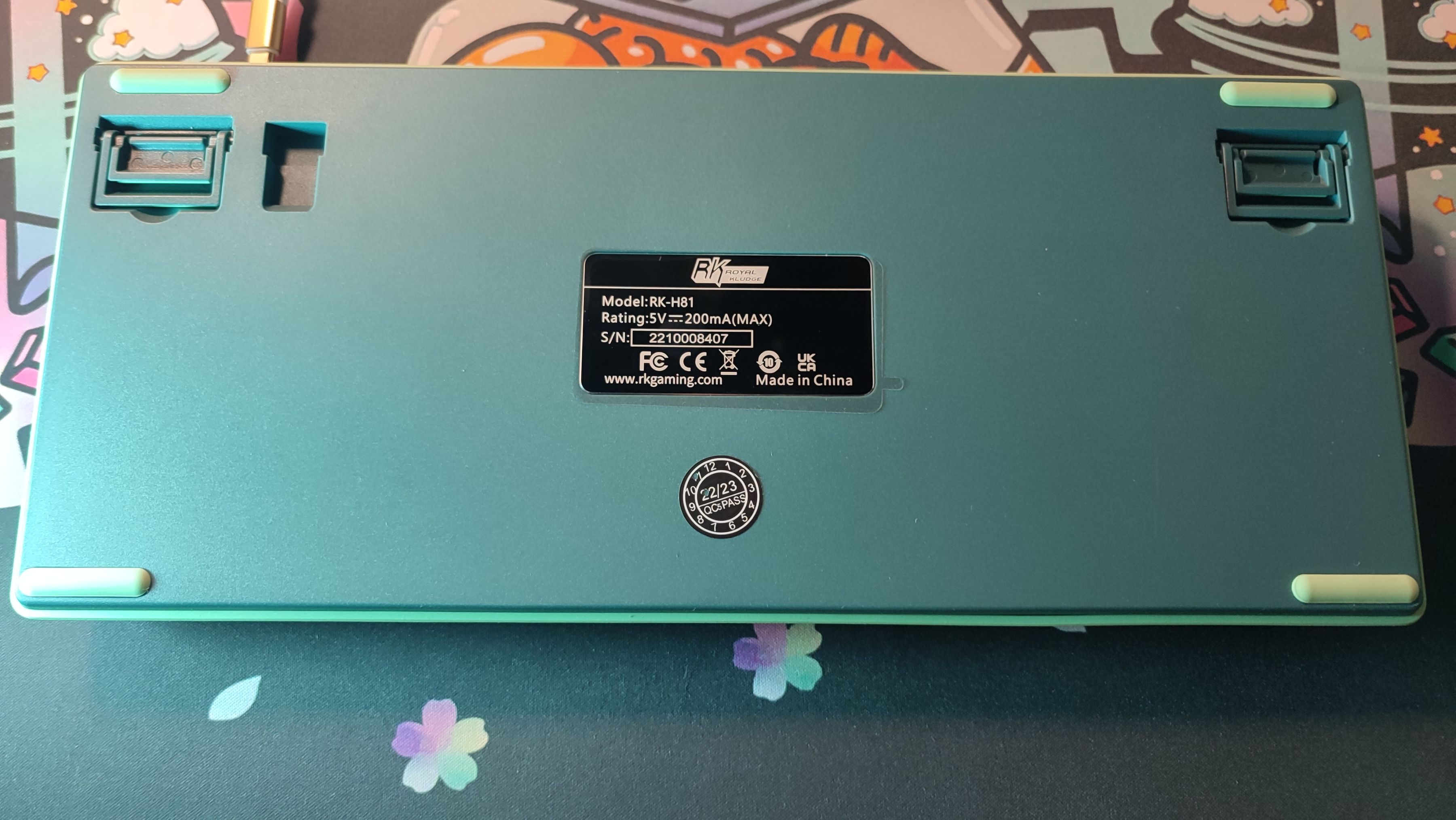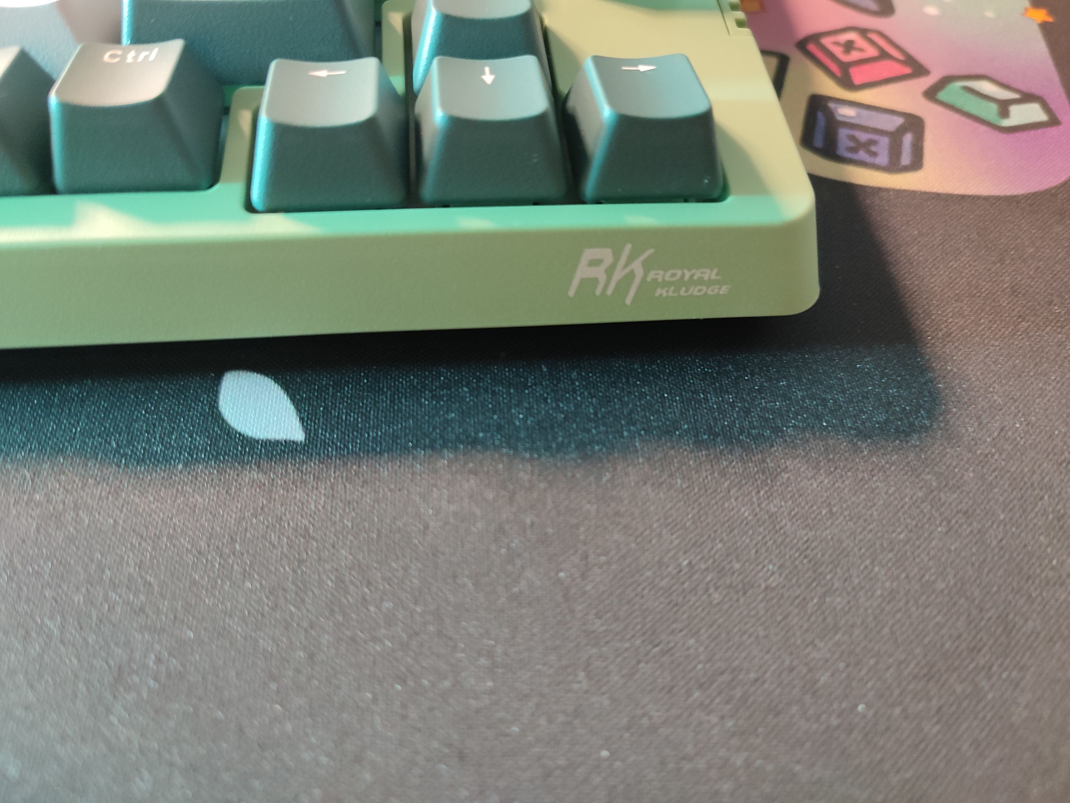 键盘正面中间做了一块切角的位置,在日常使用中避免了键盘外壳与大拇指之间的接触,在使用方面rk做的很到位。右边则是rk品牌名字以及LOGO,并不显得突兀