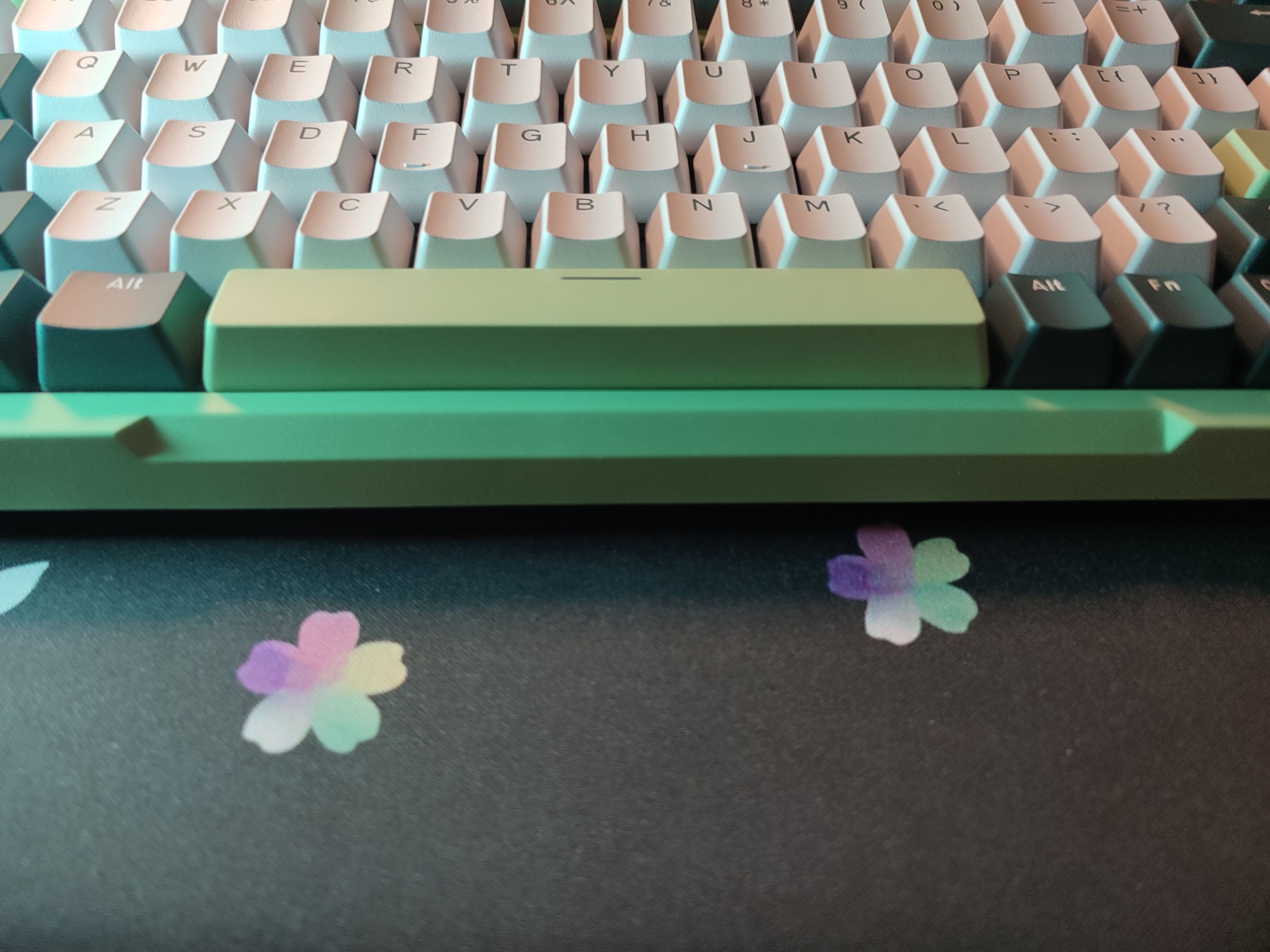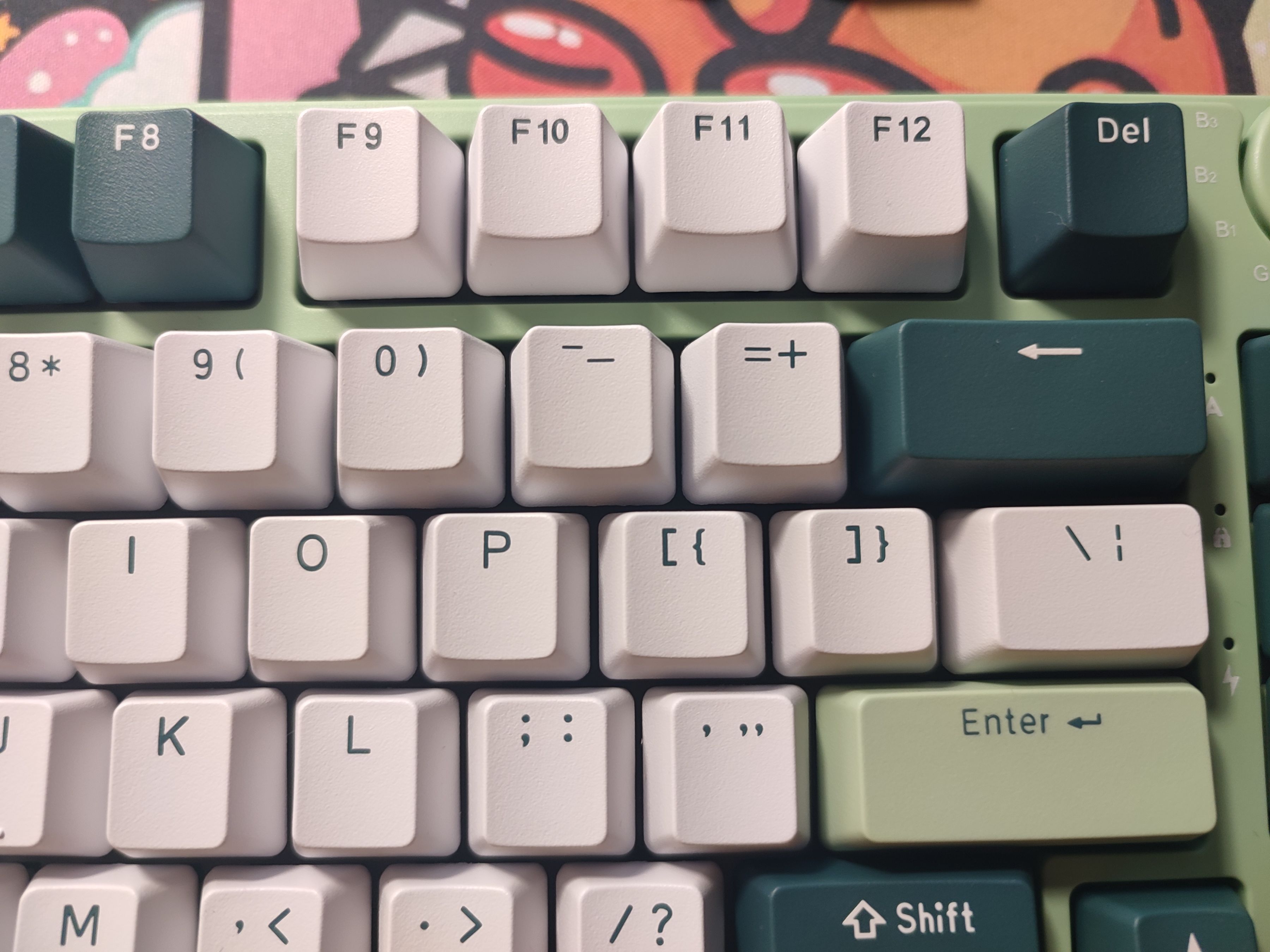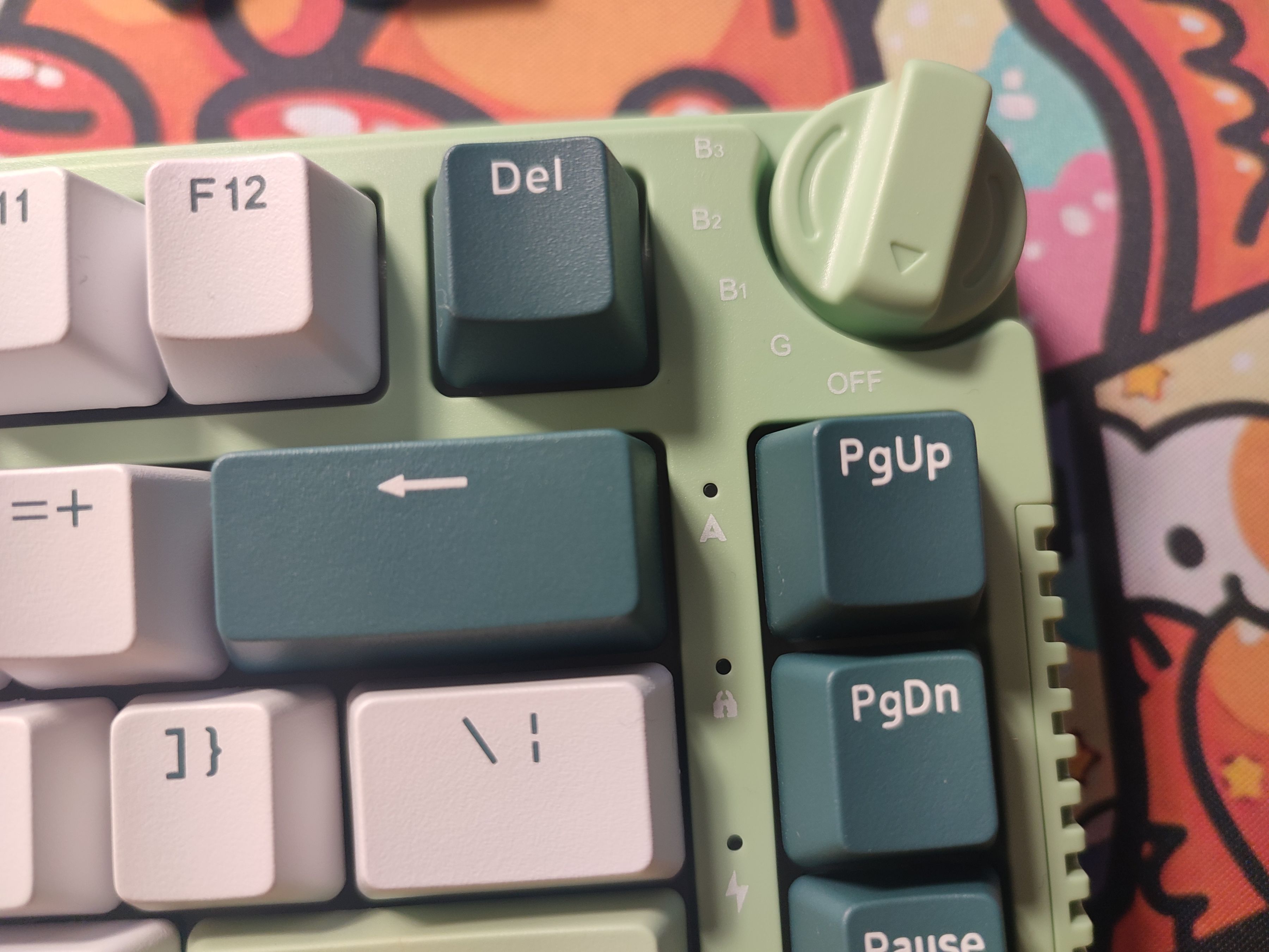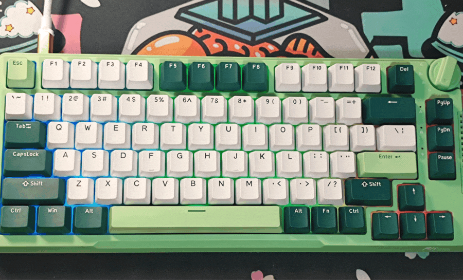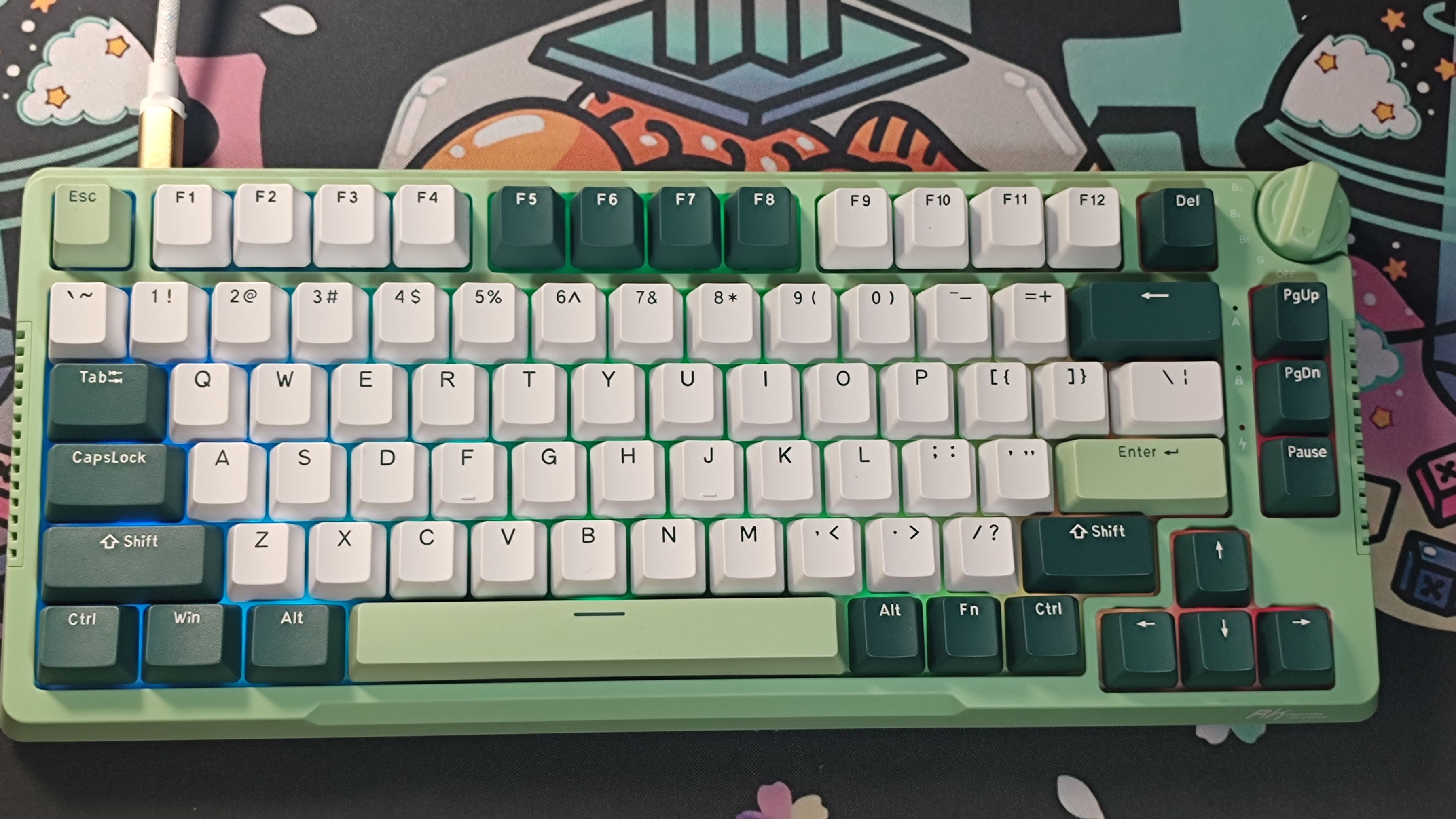 我选的是如茵配色,也就是浅绿色的版本。键盘采用了75%的配列布局,也就是去除了部分,但是故意保留了几个日常使用较多的功能键的布局。