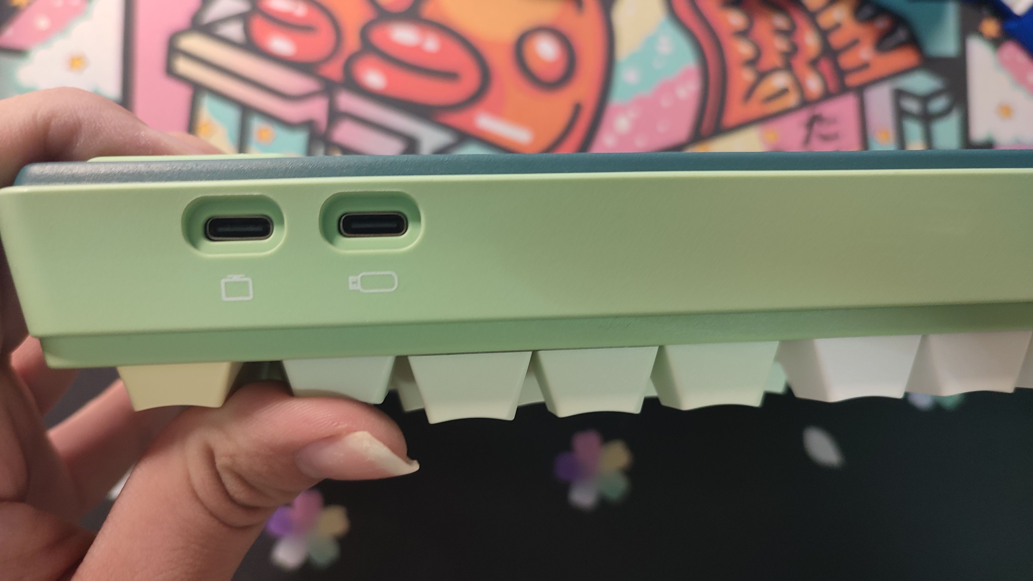 充电口在顶部左侧,并没有搭配三向出线口。我个人比较喜欢没有出线口的设计,可以兼容一些插口比较大的航插线。在他旁边的则是一个额外的C口,这时候有人会疑惑了,一个键盘有两个充电口难道一起插电脑上有额外加成?其实这个插口并不是充电用的,而是在有线模式连接电脑时,这个插口可以连接其他设备,比如连接鼠标的接收器等作用,相当于一个HUB。不过要注意的是在2.4G和蓝牙模式下这个接口不能使用。