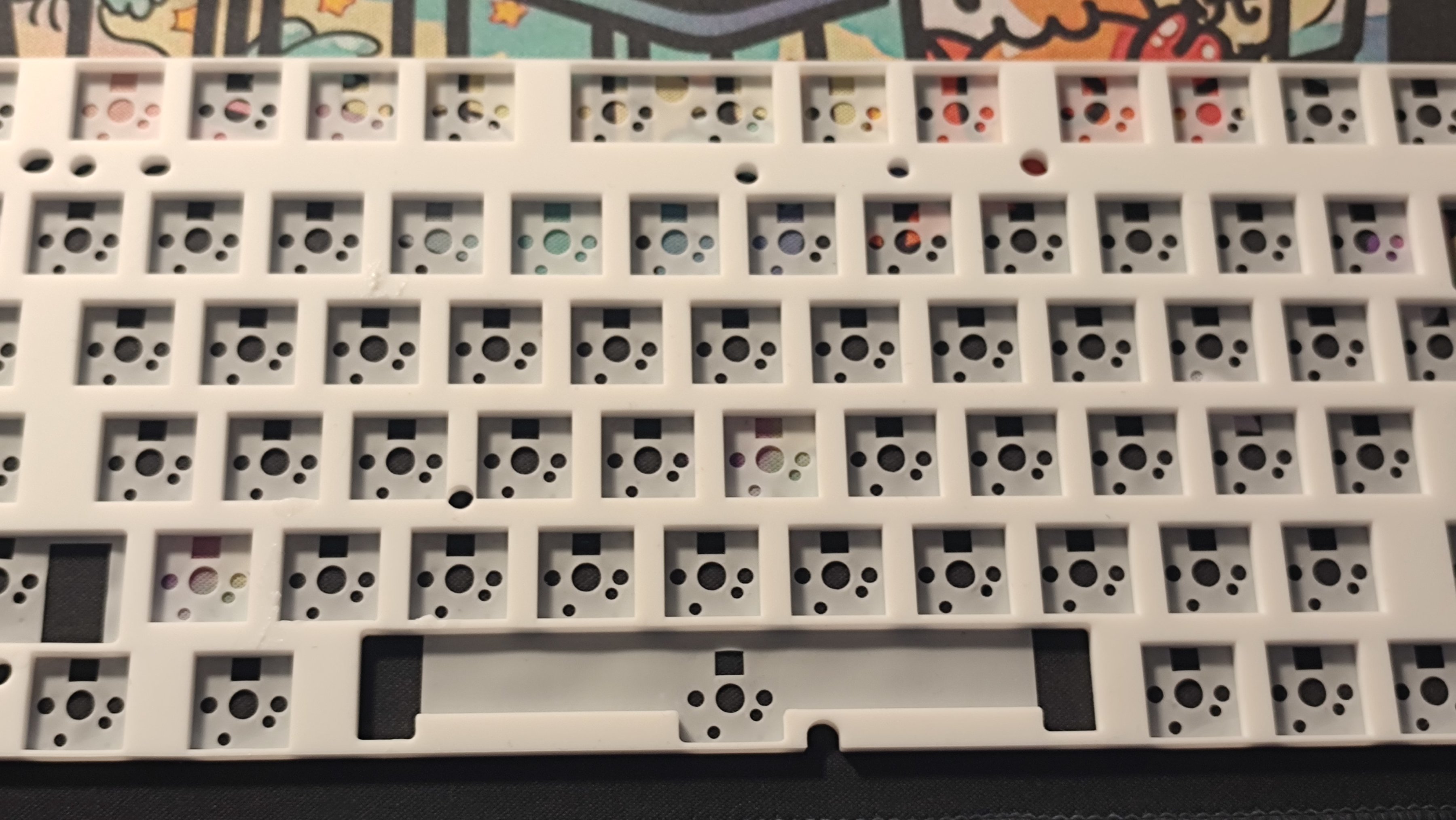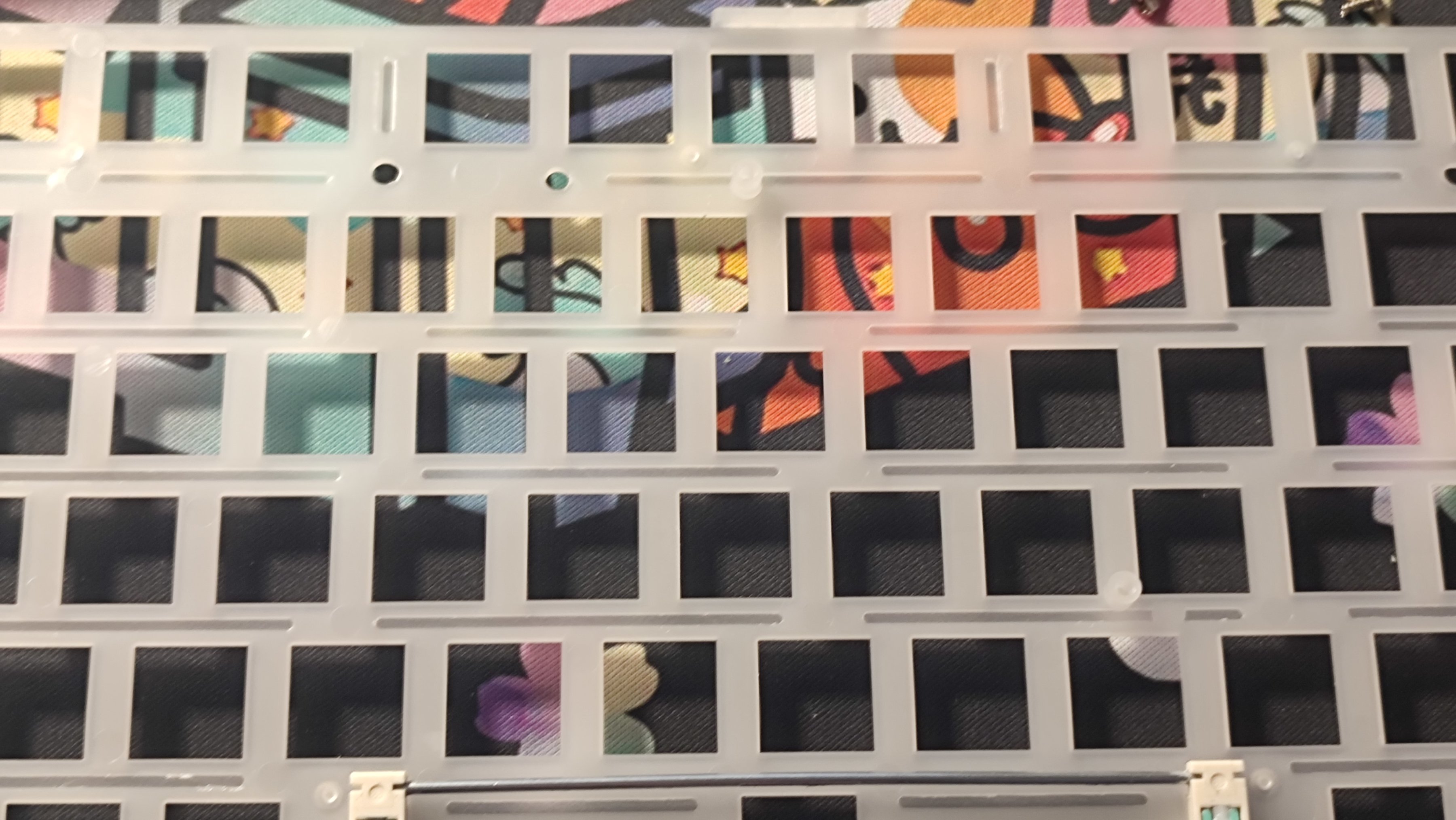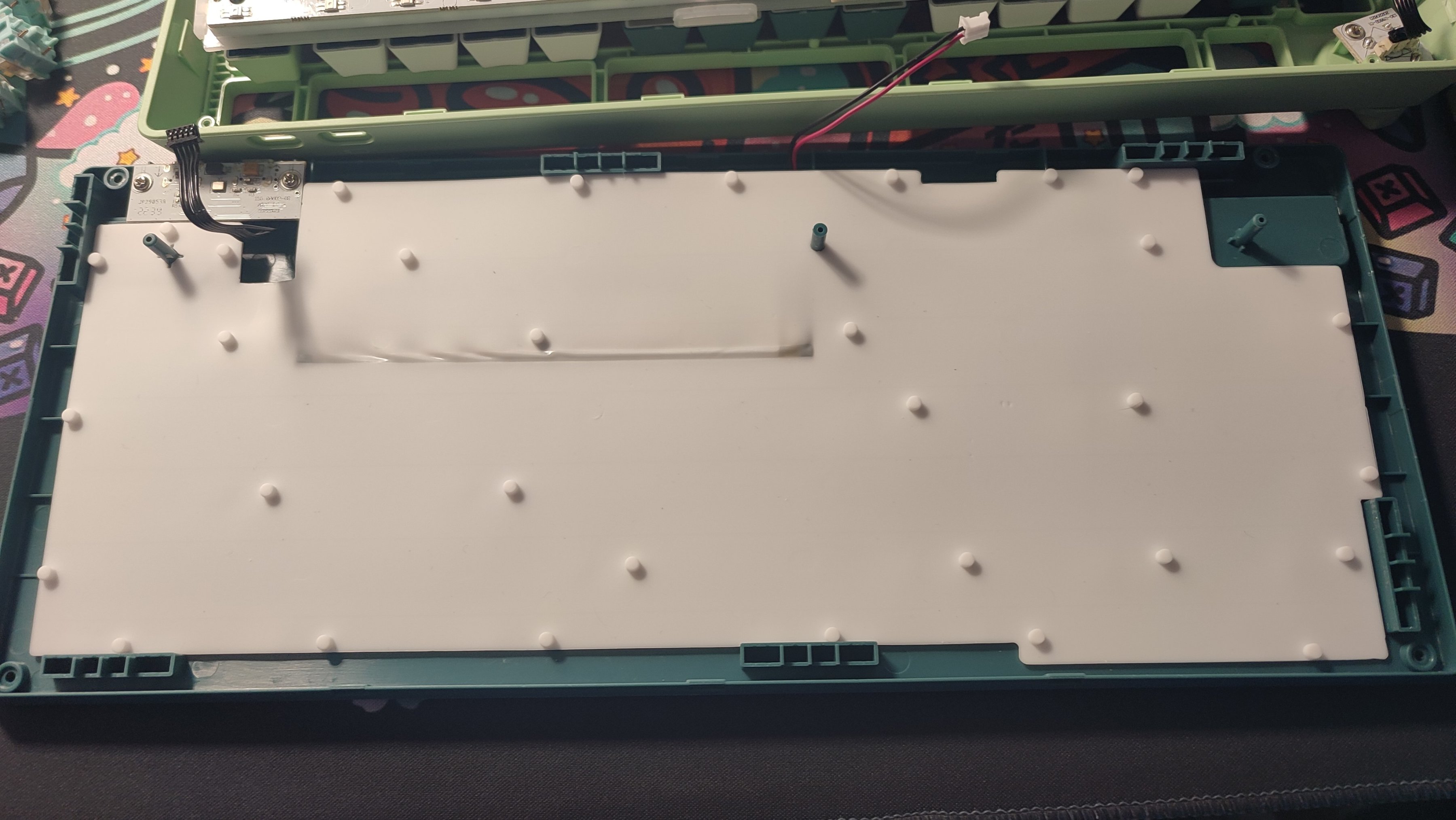 填充还是不错的,不过由于是硅胶材质,软弹方面还是不如PORON材质,所以造成了虽然有开槽定位板以及PCB,但是实际不很用力压键盘不会有很大形变。