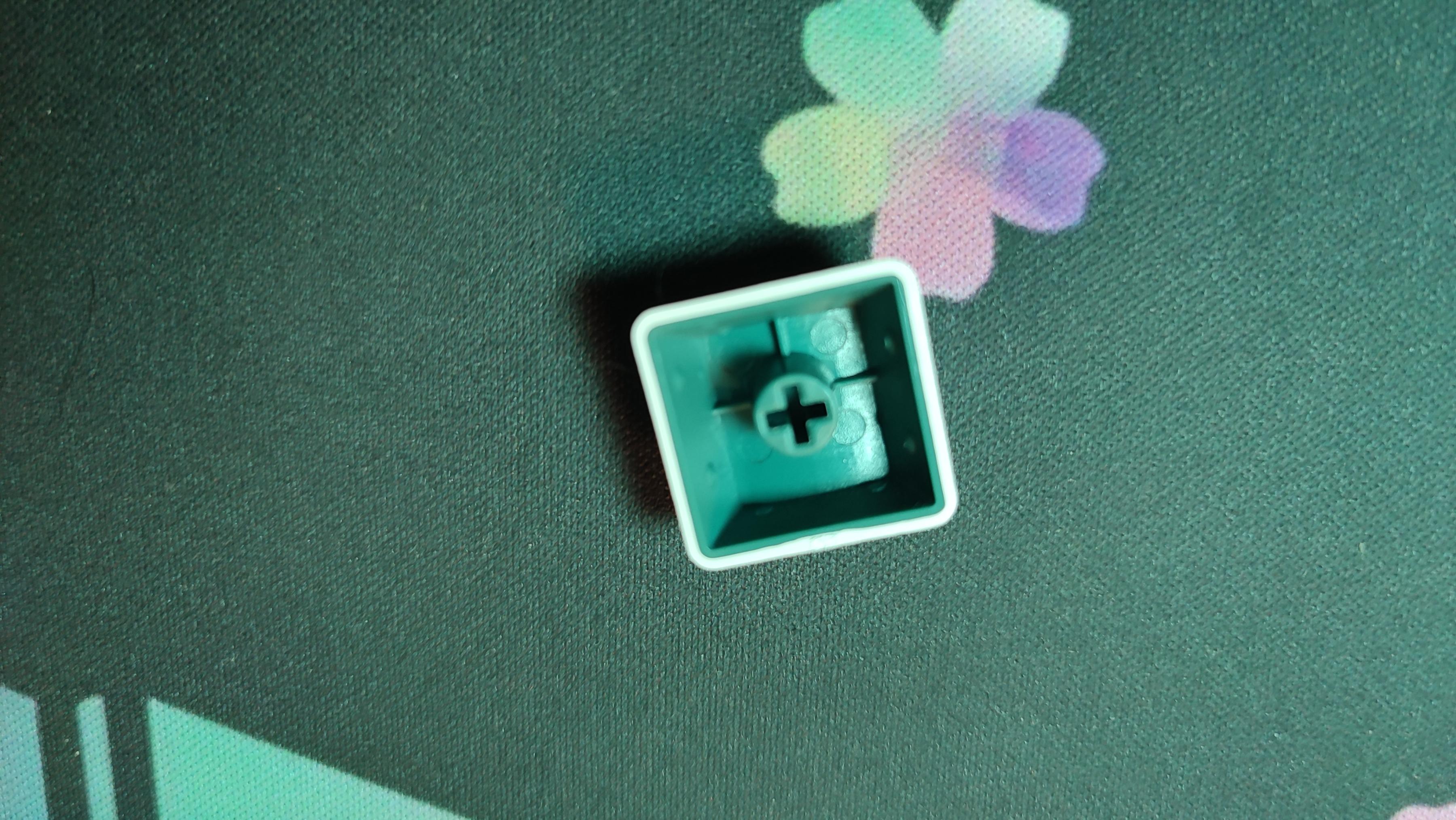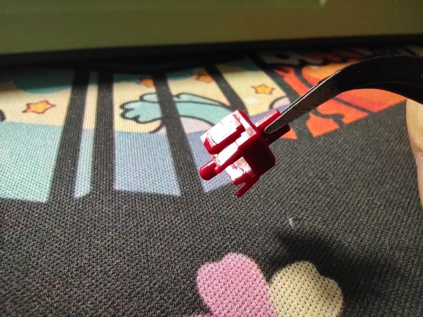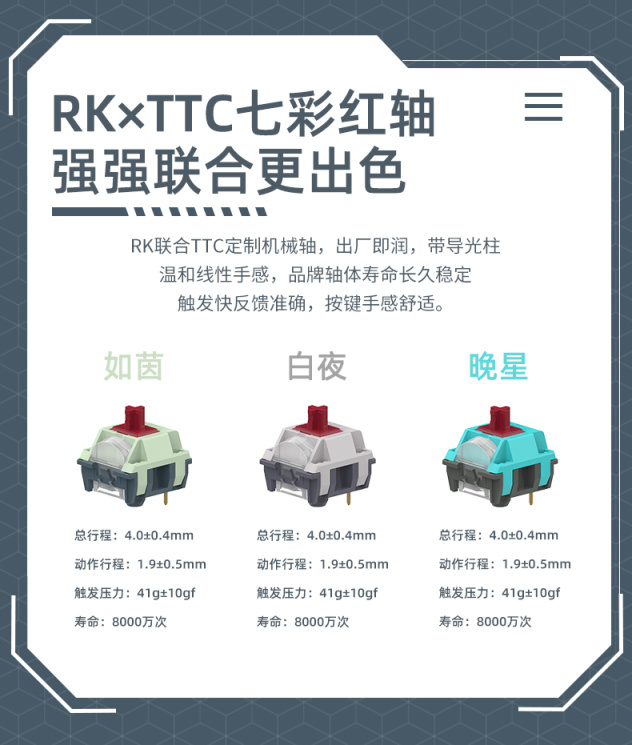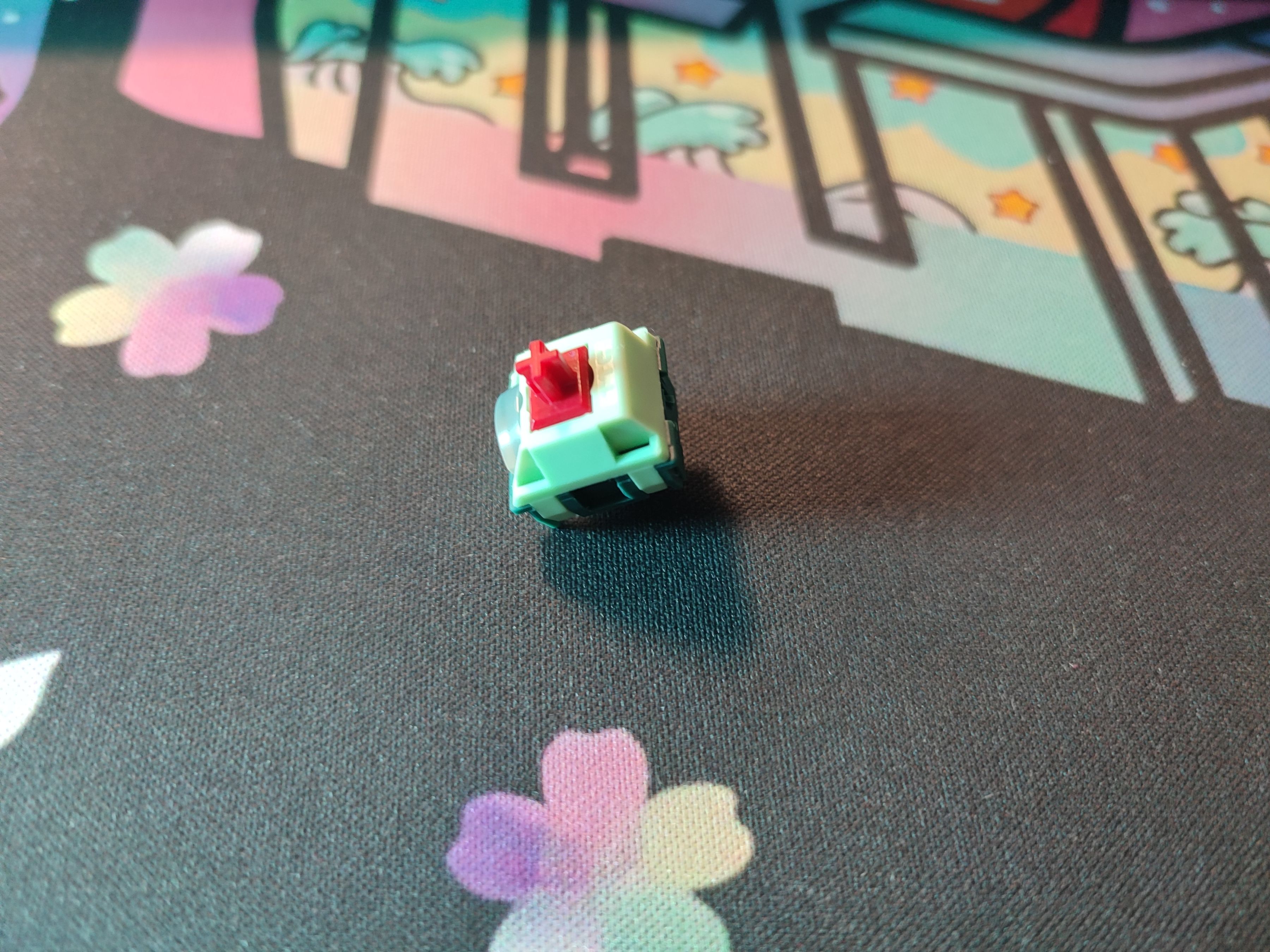 轴体采用的是和ttc联名的七彩红轴,不过此七彩红并非彼七彩虹,本质还是红轴,只不过轴体颜色会根据不同的键盘改成不同的颜色。像我手里的这颗七彩虹轴,就是采用了浅绿色上盖+深绿色下盖的配色,而其他配色的则同样是采用不同的配色。