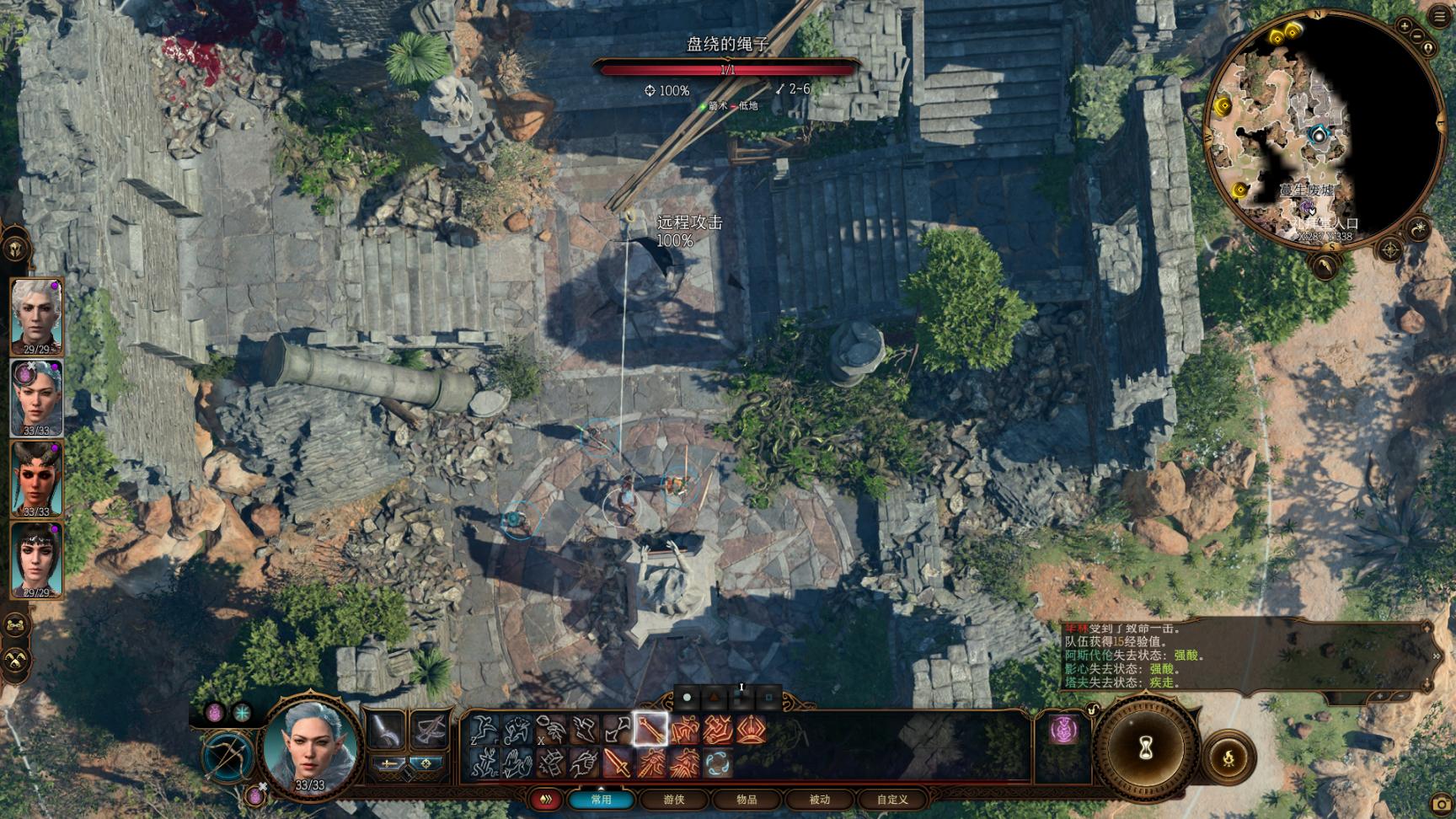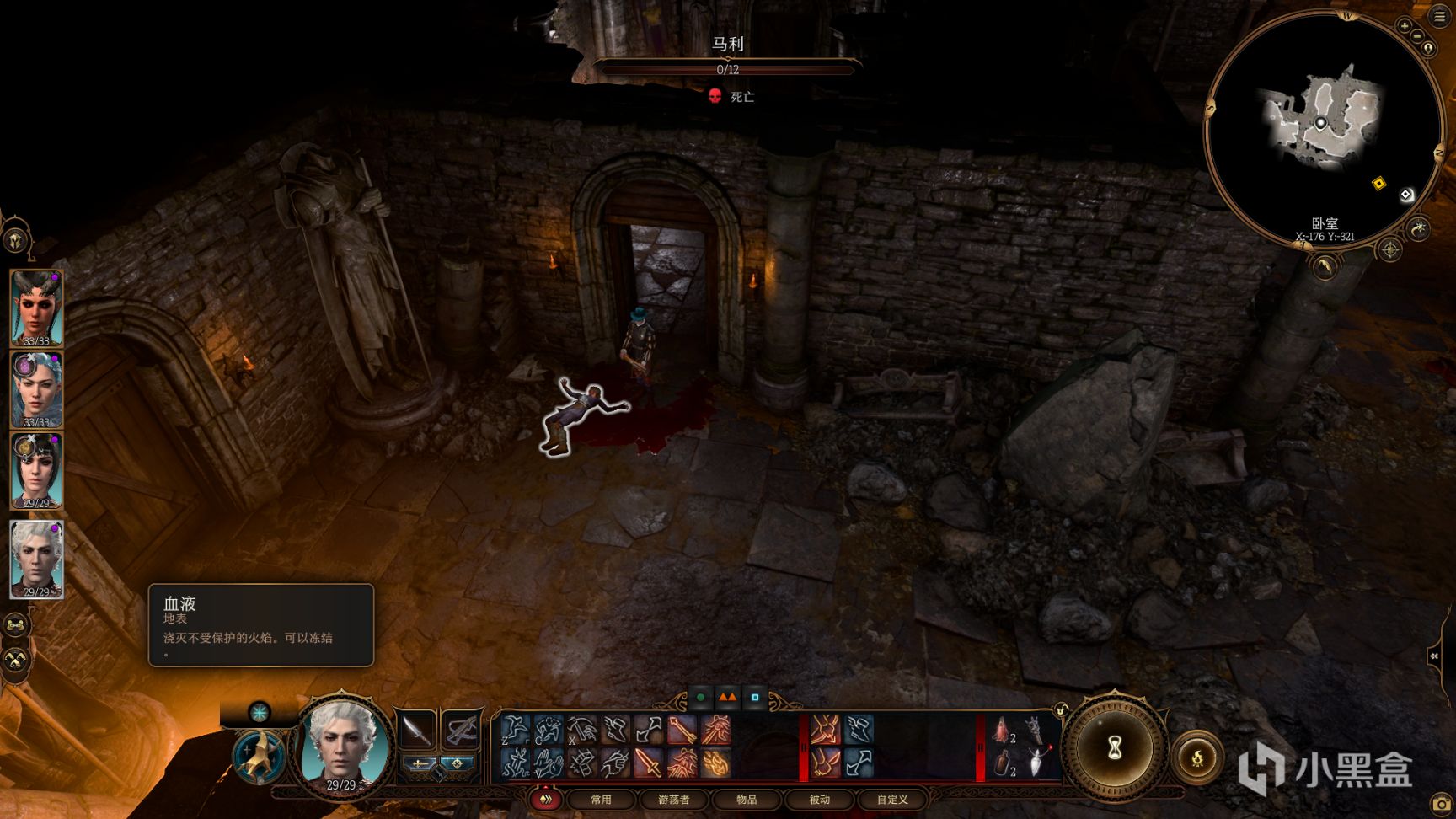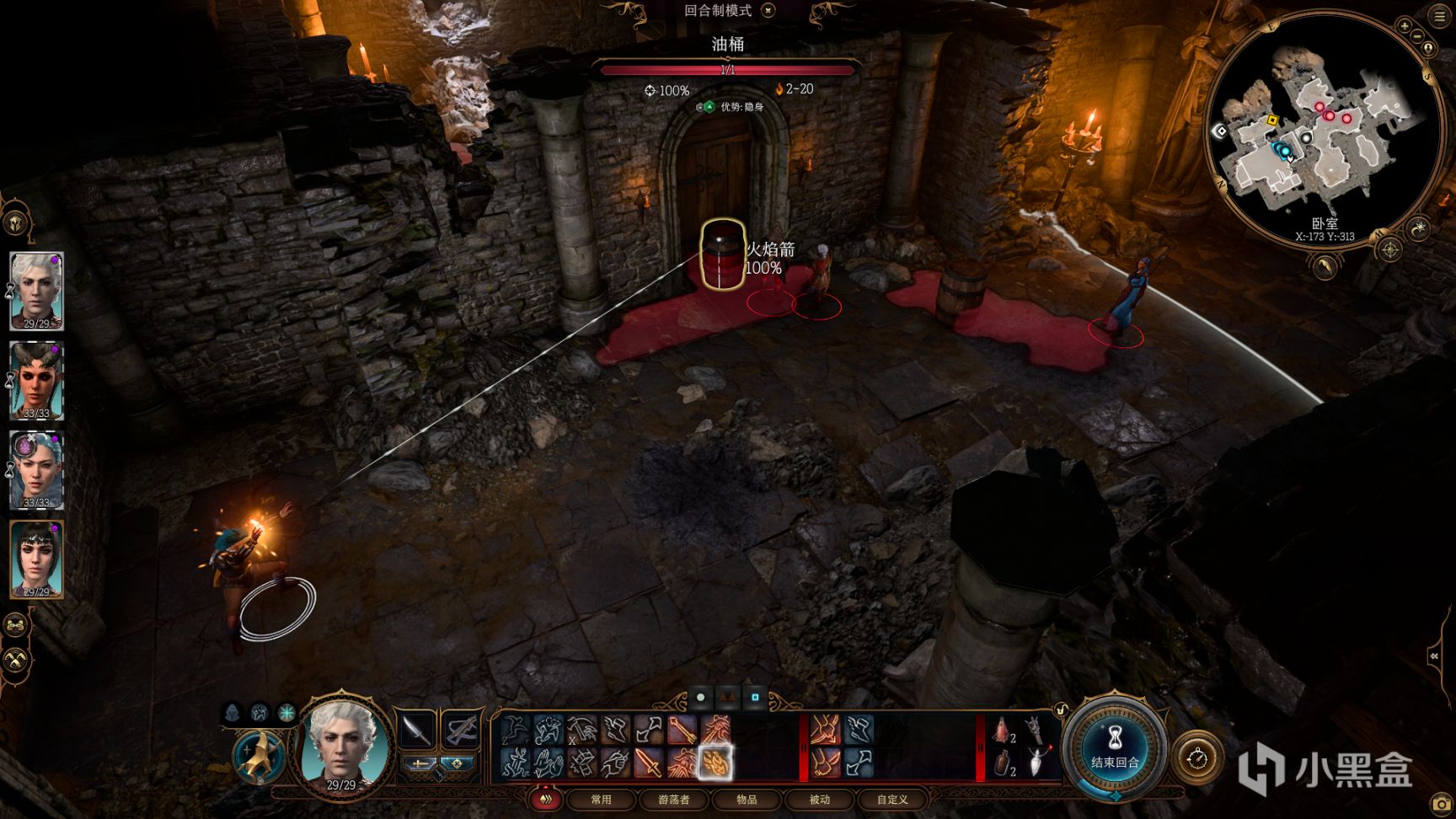 墓穴外圍的那塊搖搖欲墜的石頭,一箭把它射下來,會砸穿附近一間房屋的天花板,併發出極大的響聲,從而把敵人從緊閉的房間裏引出來。那麼又該怎麼快速擊敗敵人呢?很簡單,上圖中阿斯代倫站的位置附近是有油桶的,通過火焰加油桶引發的爆炸傷害可以直接瞬秒小怪,我們稍微擺放一下油桶,然後讓阿斯代倫蹲好,射擊油桶的武器一定要火焰附魔,可以靠蠟燭或者其他火源(比如附近的燭燈)。其餘人撤出去,一箭射下石塊,當敵人跑出來並靠近油桶後,我們按下回合制模式,然後阿斯代倫一箭點燃油桶即可。其實用阿斯代倫自帶的火焰箭戲法就可以了,我自己玩的時候就是用的這個。