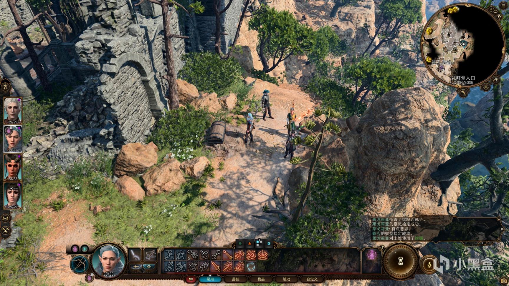 贏得戰鬥後可以搜刮一下屍體,開始探索廢墟,廢墟從外表上來看應該是個教堂,至於供奉的誰我們不得而知。廢墟里有一個值得注意的可互動道具,很多人可能發現了,就是那個掛着的石頭,打這羣強盜可以靠潛行射擊繩子來直接壓死金布爾博克等2人,戰鬥難度會大大降低。