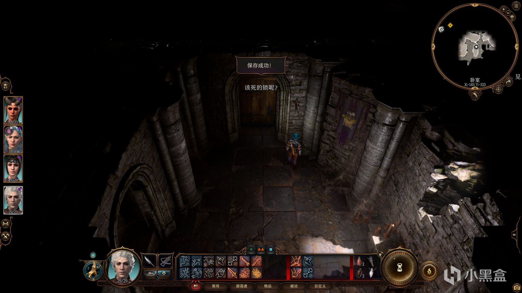 回到之前的地方,試着從教堂正門進去,發現門是鎖着的,並且觸發了一段對話劇情,門裏的人誤以爲我們是金布爾博克。BG3的對話系統和原罪2一脈相承,可以一直卡着不動,我們一邊卡住對話,另一邊派出祕密特工阿斯代倫從之前開鎖的暗道潛入,進去打探情報。