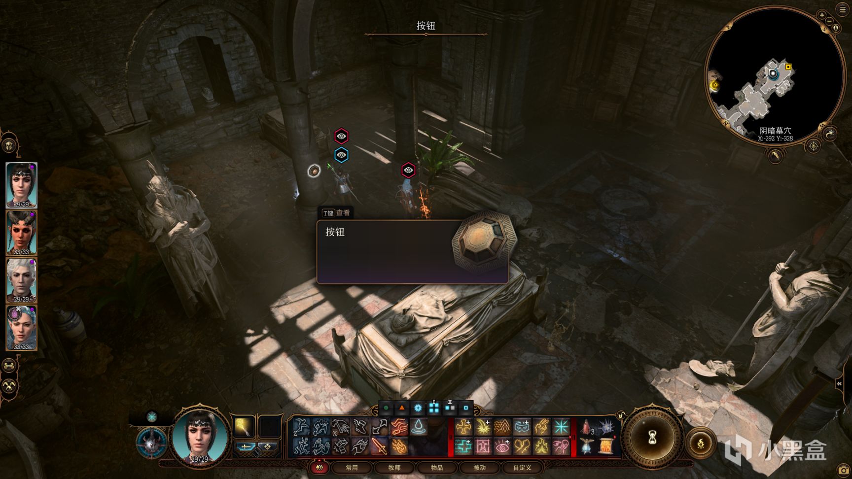 回到門口的大廳,往裏面走可以靠察覺看到一個藏着的按鈕,拉瑞安肯定是相信好奇的你是一定會按下這個按鈕的,所以把一個非常有用的道具藏在了這裏。按下按鈕,周圍那些死去的屍體突然復活(我第一次玩的時候甚至有點害怕)。對於3級隊來說,戰鬥難度不是很高,輕鬆拿下,如果你之前搜刮過他們的屍體,那他們復活後武器都不會有。打完後走進新發現的小密室,裏面的箱子裏能發現一個可以讓你隨意使用死者交談(萌新可以把它當成原罪2的靈視)的護符,大棺材掀開來後可以觸發一段新劇情。