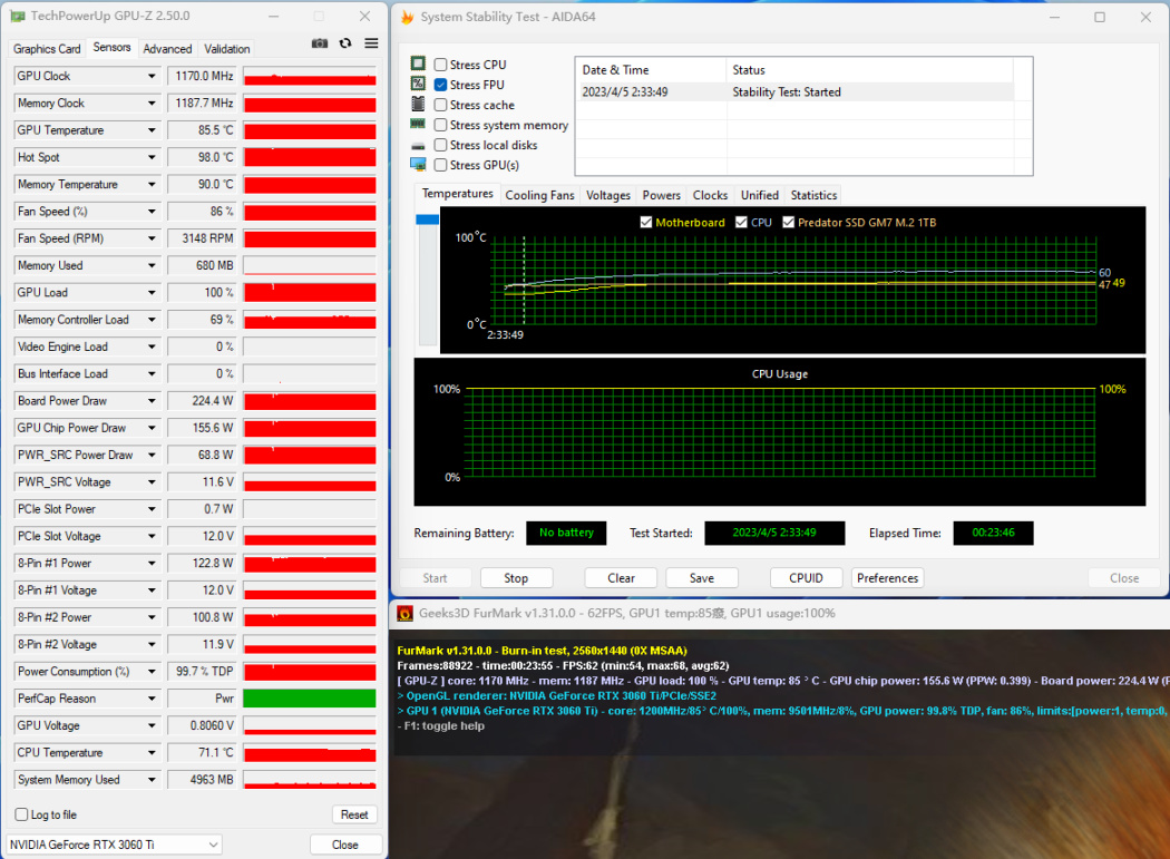 甜甜圈+FPU雙烤20分鐘,顯卡溫度85°,CPU溫度71°,顯卡滿載功耗225W左右。(室溫25°,機箱側板合上了)