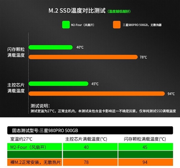 散熱效果方面,號稱可將三星980 PRO的主控、閃存溫度分別從94℃、78℃降低到45℃、40℃。