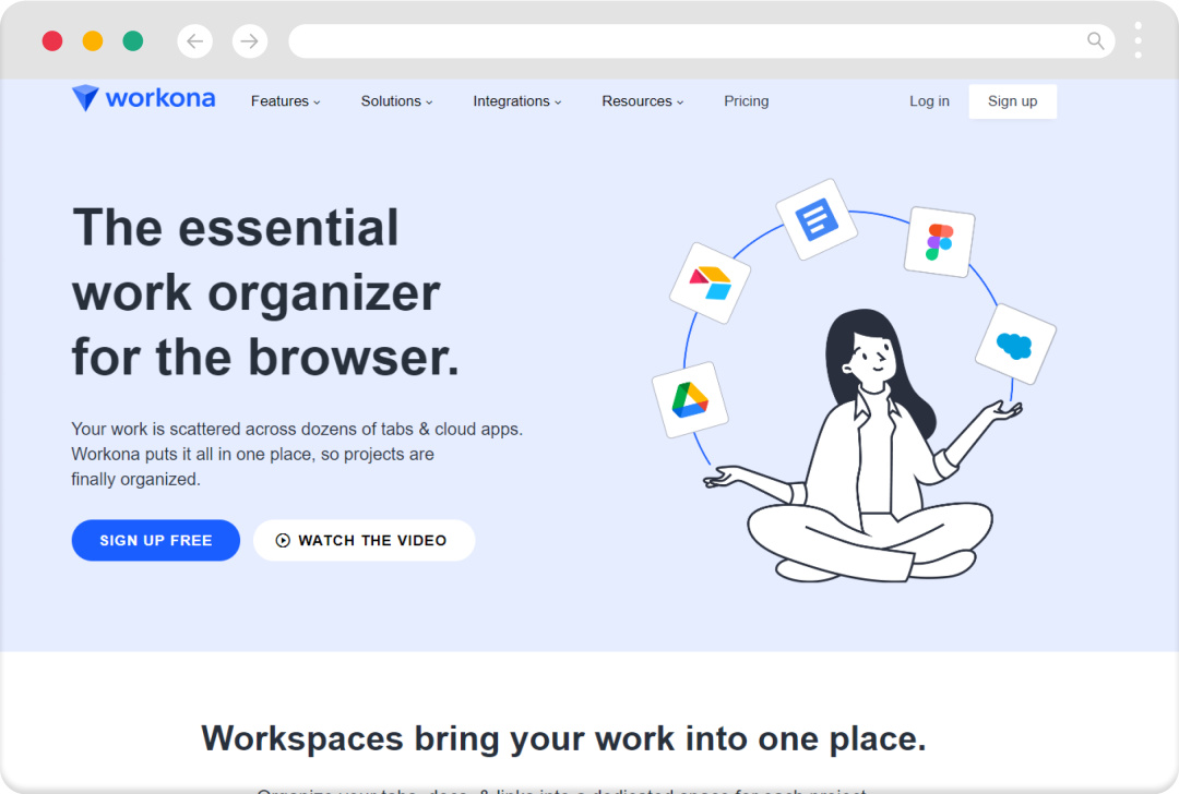 Workona 是一款專注於工作場景的書籤管理工具,旨在幫助用戶更加高效地管理工作內容。Workona 支持將多個瀏覽器選項卡整理成工作區間,並且可以將相似的工作區間分組,便於快速查找。