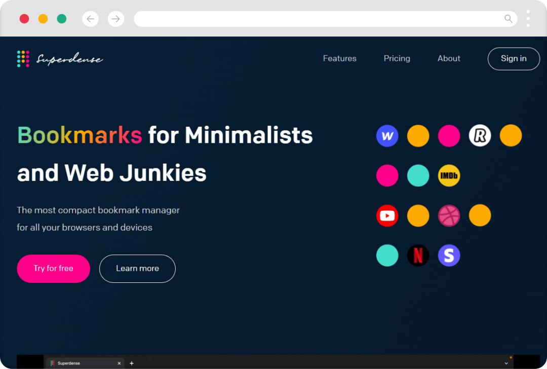 Superdense 是一個在線書籤平臺,用戶可以在上面保存和組織自己的書籤,支持標籤、分類、搜索等功能。它還提供了智能推薦和社交分享功能,可以幫助用戶發現新的有趣網站和內容。