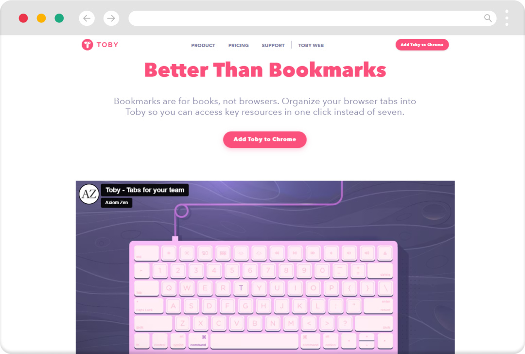 Toby 是一款基於瀏覽器擴展的書籤管理工具,可以將多個瀏覽器選項卡整理成集合,方便用戶在不同選項卡之間快速切換。用戶可以將多個集合整合成一個項目,並且可以將不同項目保存在不同工作區間下,便於管理。