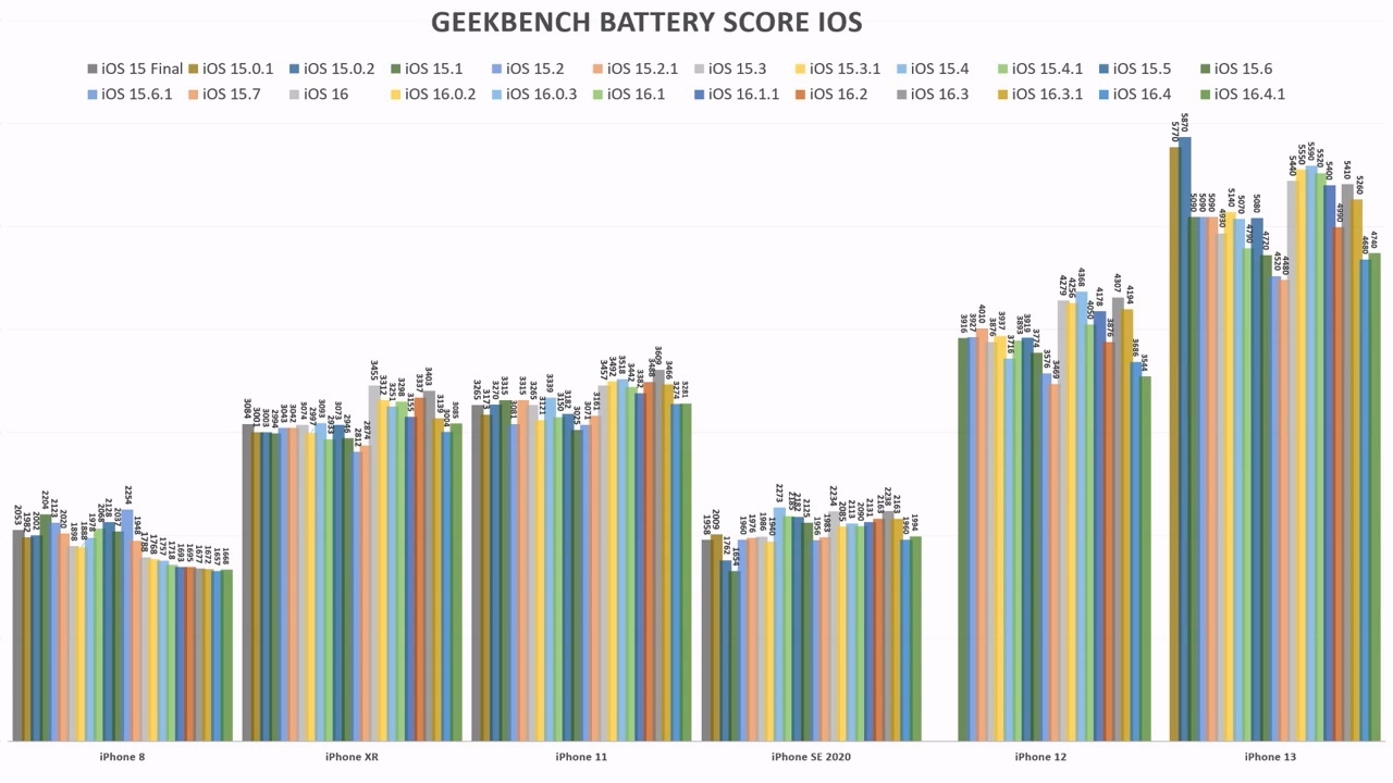 根據 iAppleBytes 測試,上週五發布的 iOS 16.4.1 更新並未修復續航問題,部分 iPhone 機型的 GeekBench 4 電池測試分數有所上升,還有部分出現下降趨勢。整體來說變化幅度很小,本次更新並未恢復到 iOS 16.3.1 以及此前版本續航水平。