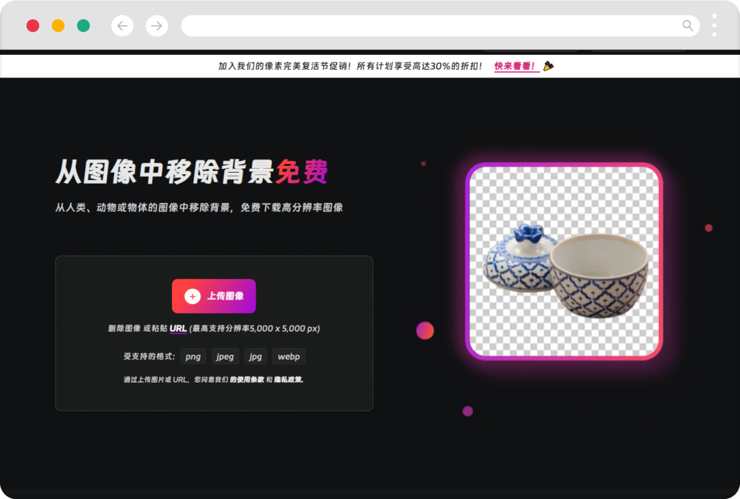 Erase.bg是一款基于人工智能技术的图片背景自动去除工具,可以自动识别并去除图片中的背景,使用户轻松获得高质量的无背景图片。Erase.bg的算法支持处理各种复杂场景,如人物、动物、物品等,能够自动适应不同的图片质量和背景复杂度。