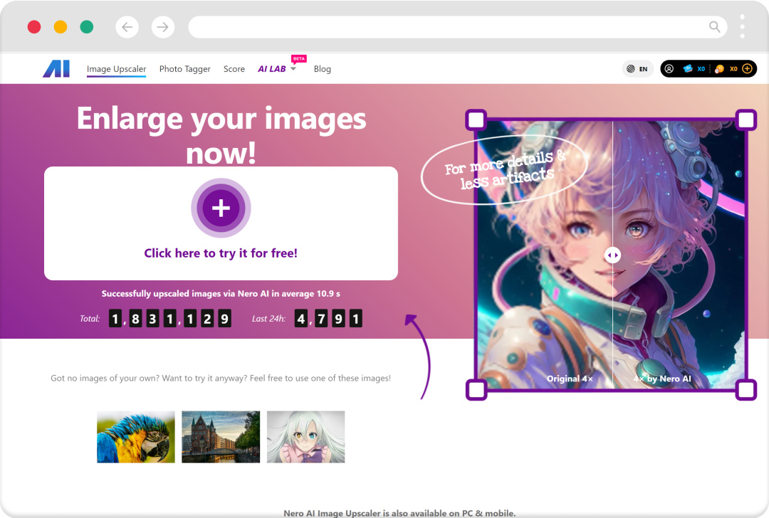 Nero AI 是一个针对图片处理的网页服务。用户无需下载多余的应用,在线就可以处理图片。每天都可以免费对AI生成的图片进行无损增强,效果非常明显,同时可以直接将自己AI生成的图片制作成4K壁纸。