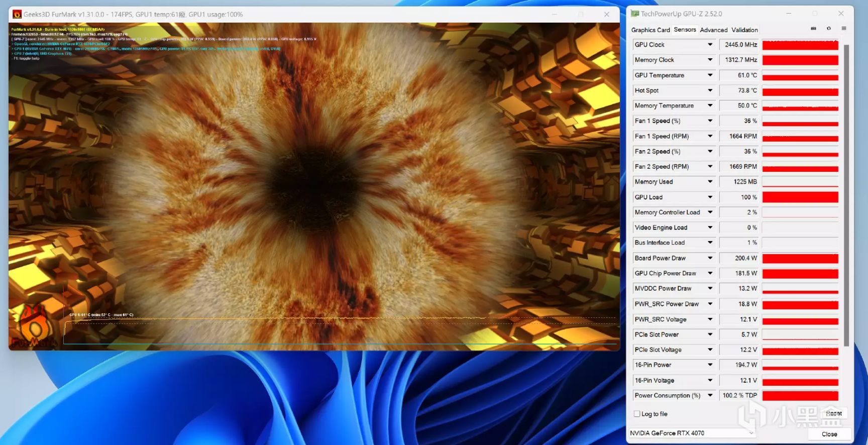 室温23度,非开放式的机箱Furmark烤机显卡测试30分钟,iGame RTX 4070 Ultra W V2显卡最高61度左右,风扇转速1664RPM左右,非常安静噪音很低,GPU核心频率2445MHz左右,烤机功耗在200W左右,但游戏功耗不会超过200W。