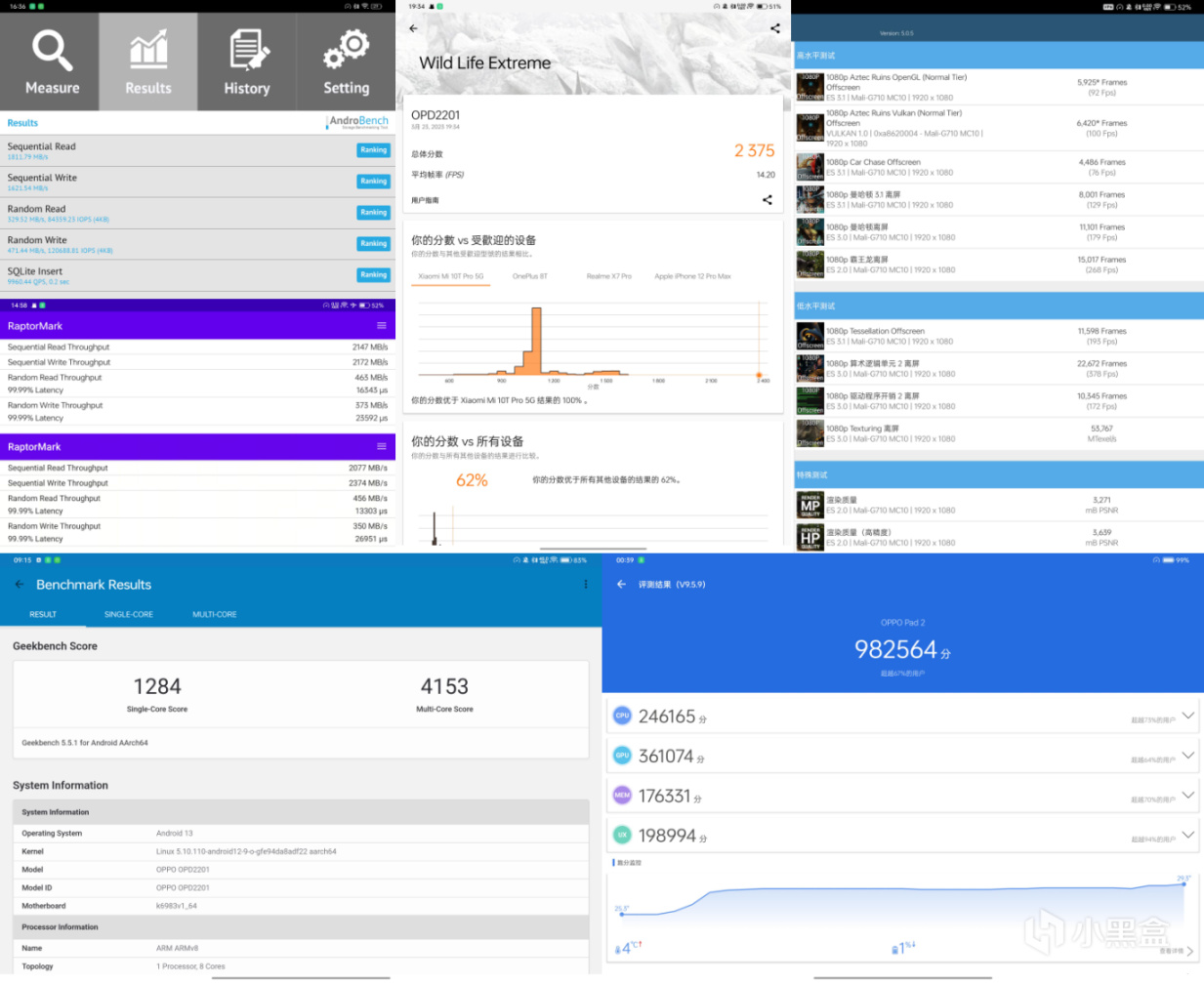Geekbench 5单核1284,多核4153。3DMark Wild Life Extreme得分2375。GFXBench如图。