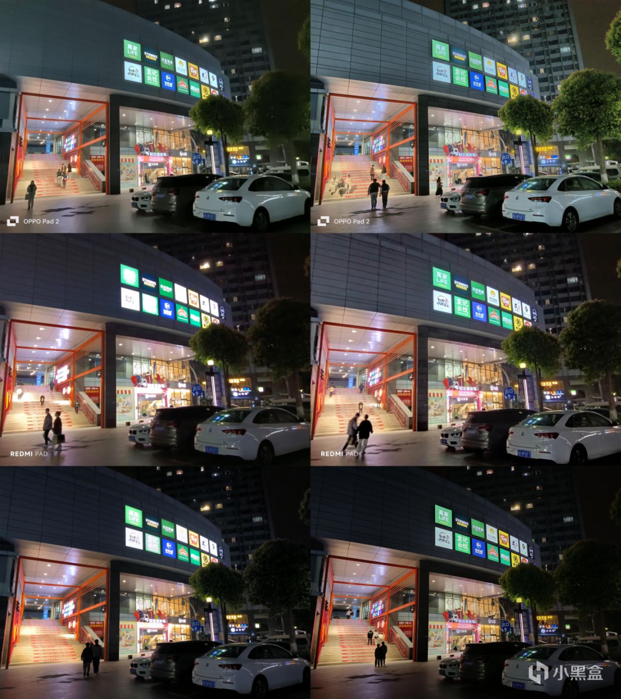 到了夜间,OPPO Pad 2提供了夜景模式,甚至还有脚架模式。正好其他两款机型也都有夜景模式,我们放在一起对比,左正常模式右夜景模式。