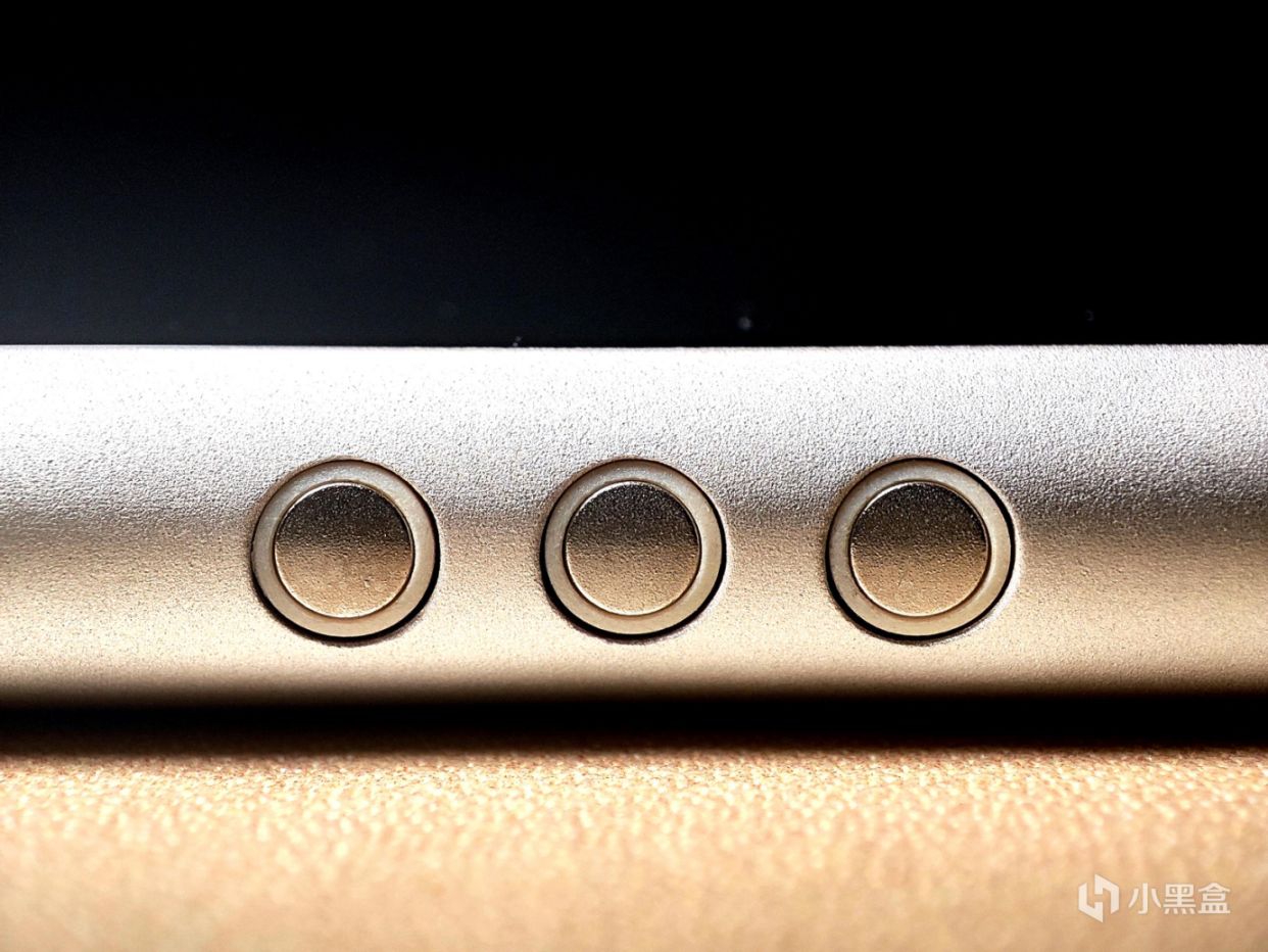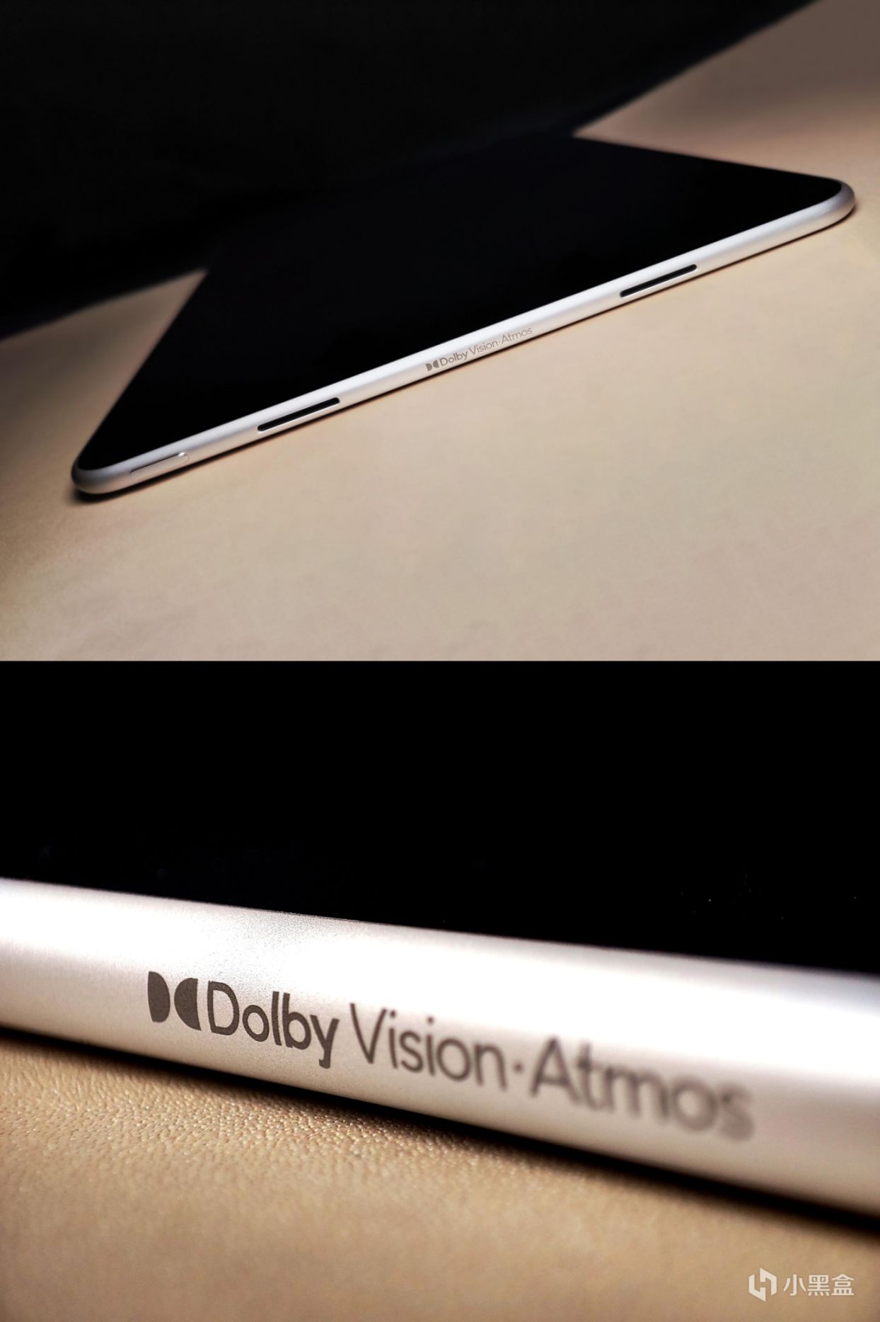 左侧分别是电源键、两个扬声器开孔,中间位置有杜比视界全景声的logo。