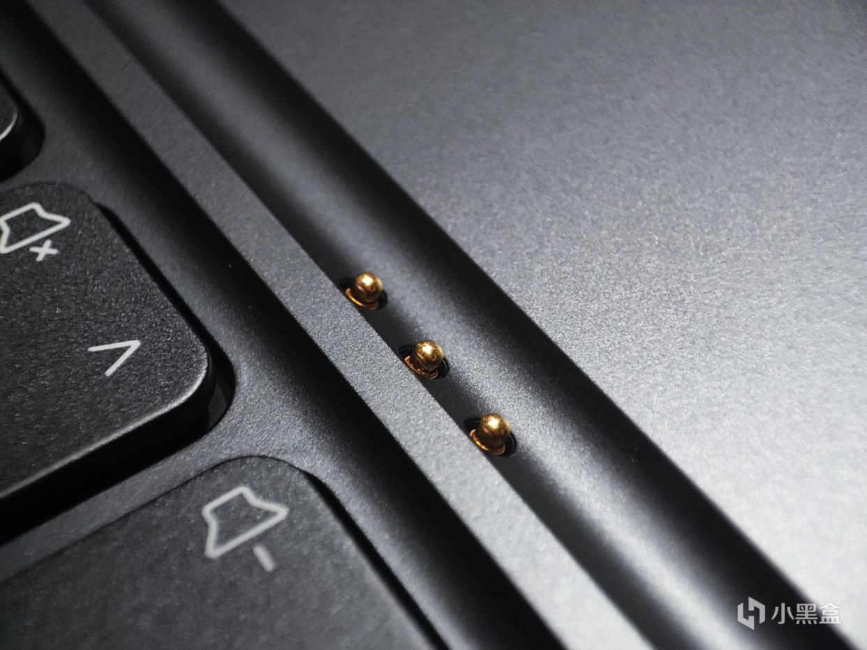 在底部中间位置,则预留了三颗金属触点,用于连接键盘触控板。