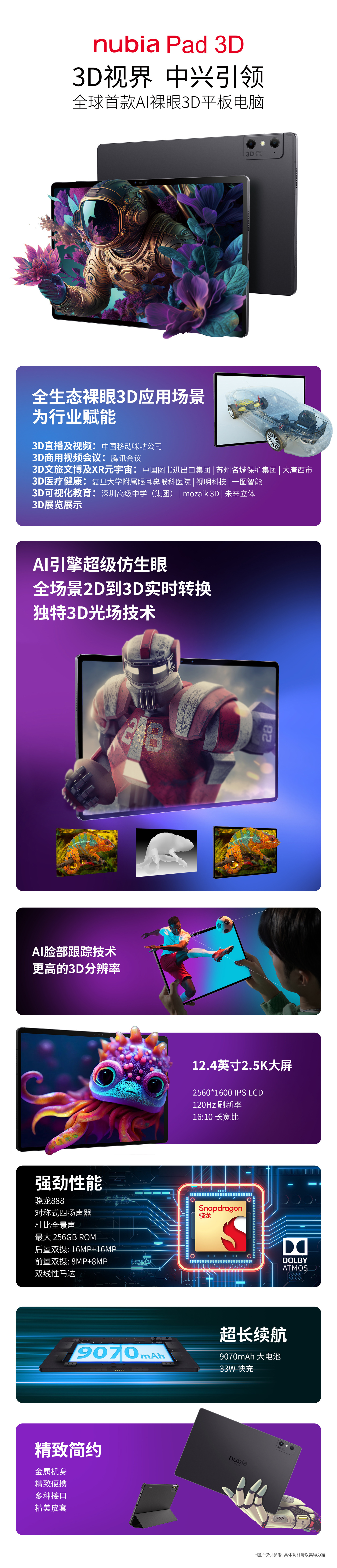 努比亞 Pad 3D 是全球首款 AI 裸眼 3D 平板,由中興與裸眼 3D 技術研發公司 Leia 聯合開發,搭載獨創的 3D 光場顯示技術,同時擁有強大的 AI 算力引擎,以匹配豐富的 3D 應用場景:可實現 AI 人臉追蹤,實時匹配最合適的視角(提供 8 視場角)。