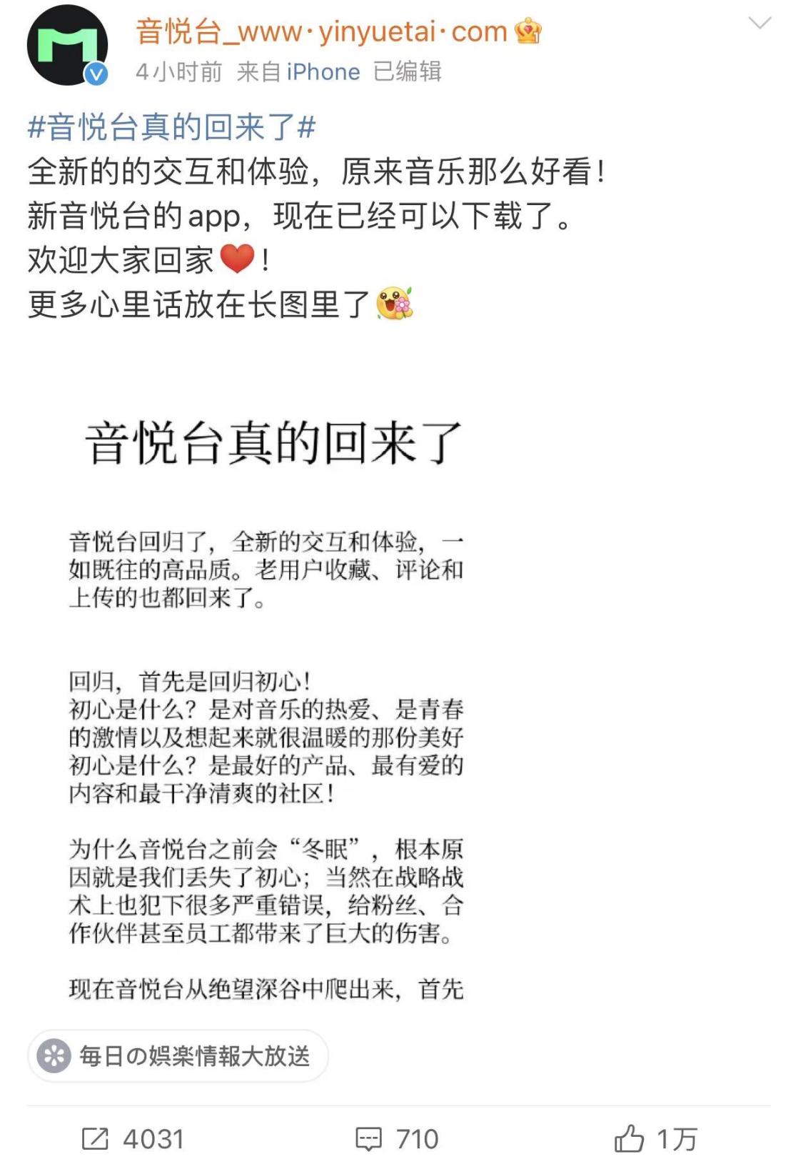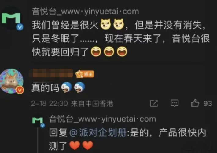 直到今年2月份,音悅臺官方在微博又重申自己很快就會迴歸了。