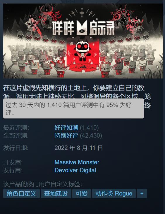 目前該遊戲在Steam上的玩家口碑還不錯,過去30天內的好評率還達到了“好評如潮”的程度。