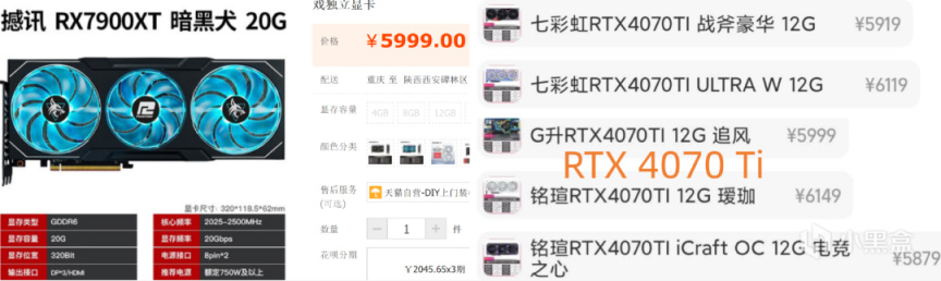 目前这两张显卡的市场最低价都在5900多米。如果玩新游戏想体验光追,建议选支持DLSS 3的RTX 4070 Ti,如果不喜欢DLSS开启后的游戏画面 更喜欢游戏的原生画质,可以选RX7900XT。有生产力软件需求,建议选支持CUDA的4070Ti。