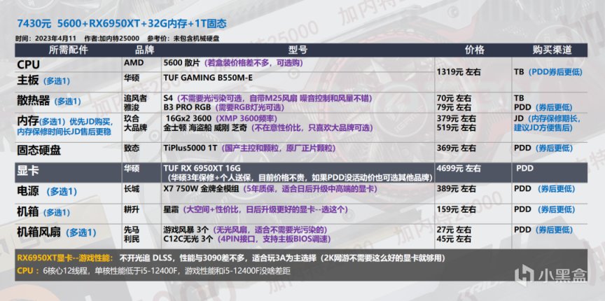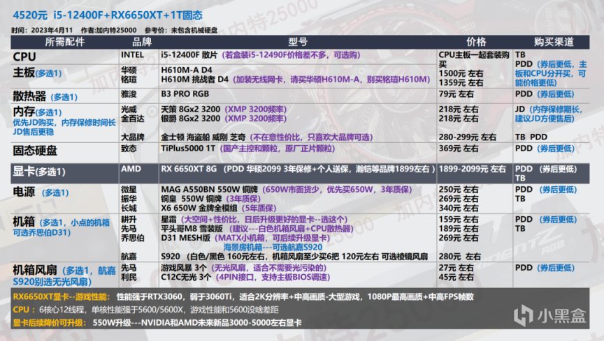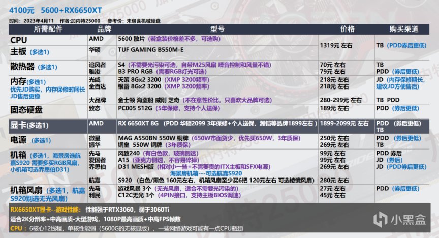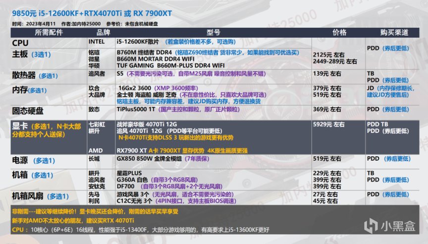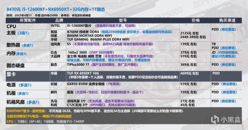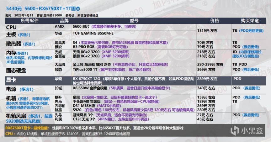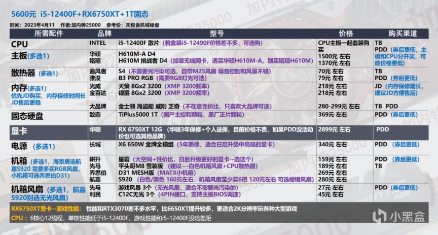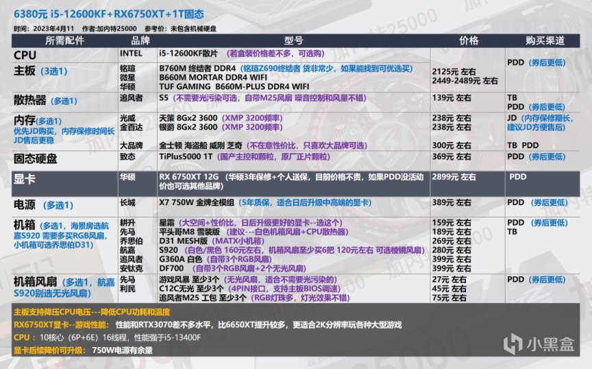 显卡RX6750XT 我做了3套配置推荐,刚需玩游戏选前两套,对CPU有高要求,未来可能有升级显卡的计划,可选i5-12600KF方案
