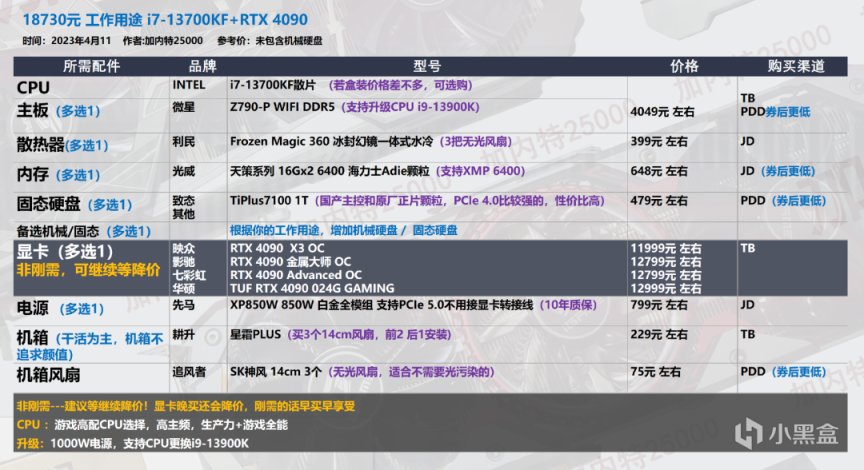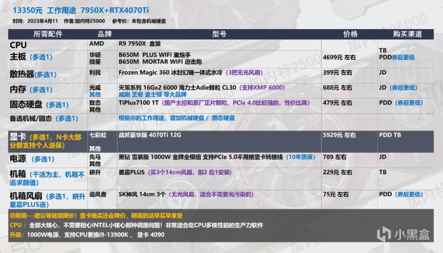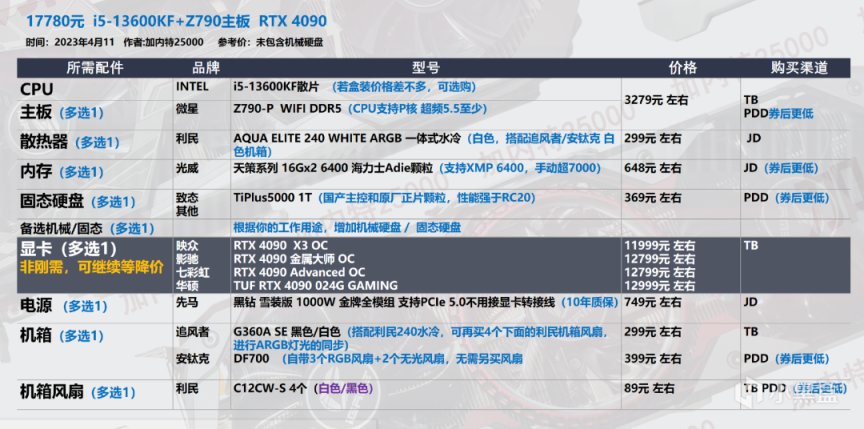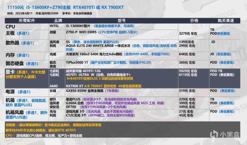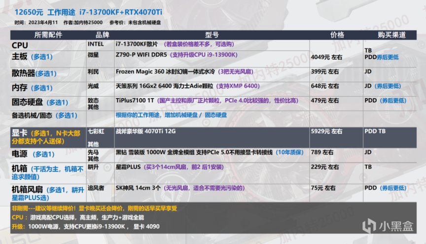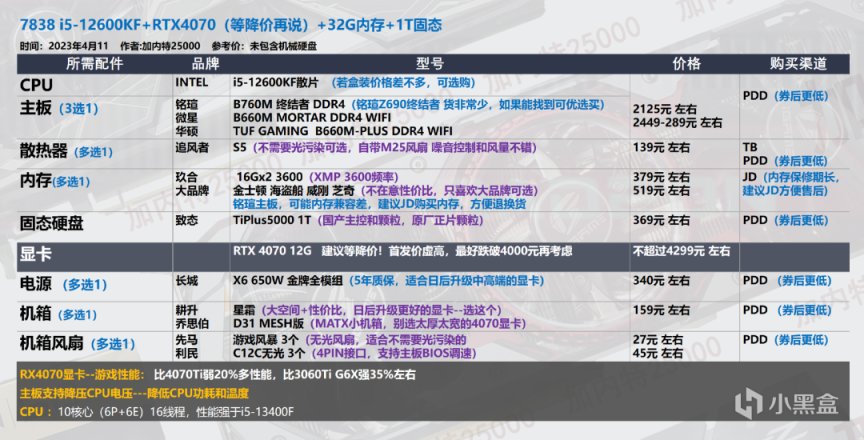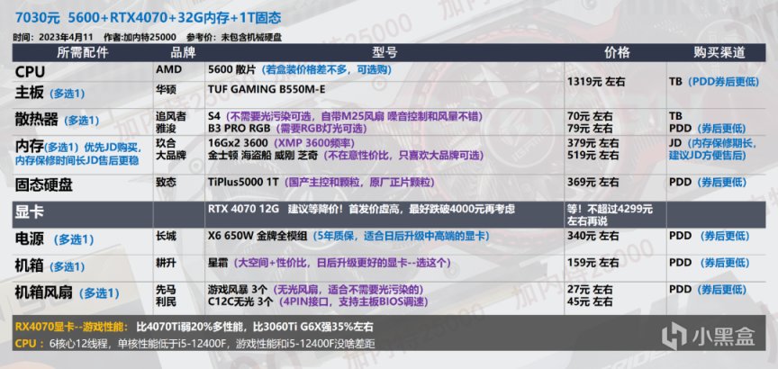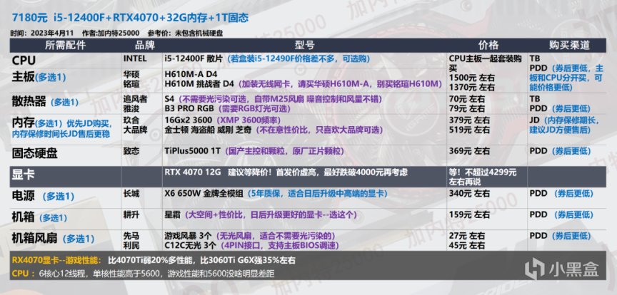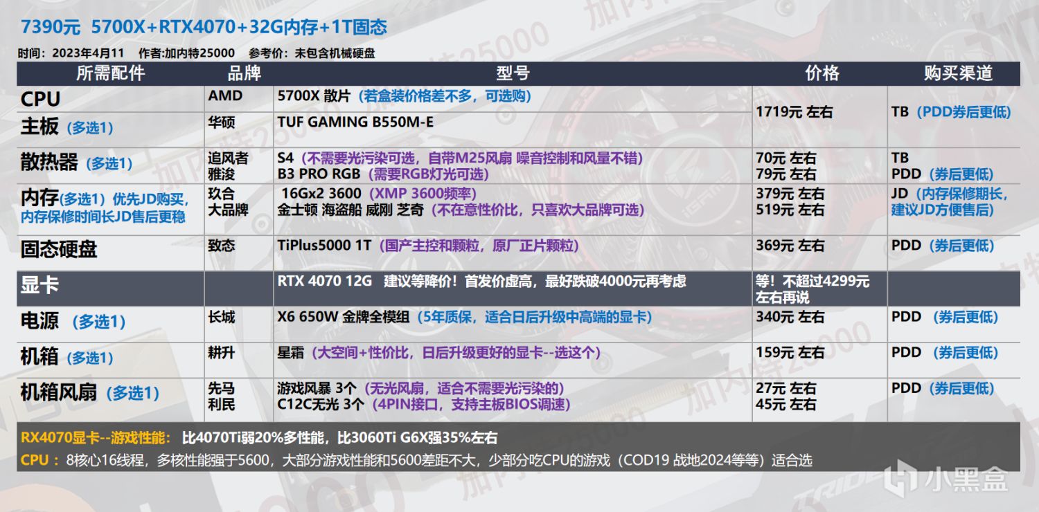 4070显卡,建议等它降价至少500再说,等跌到4299米再考虑,推荐配置全当一个参考,现在不推荐购买,刚需游戏用途建议买6950XT显卡