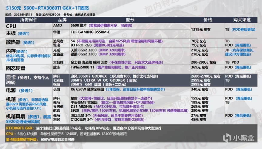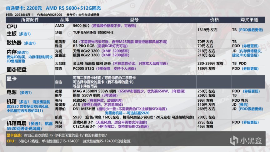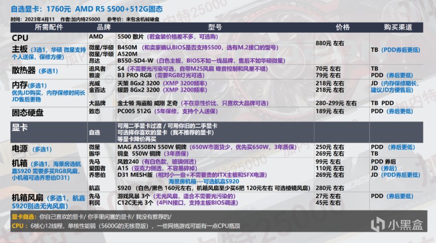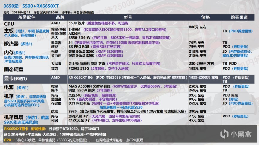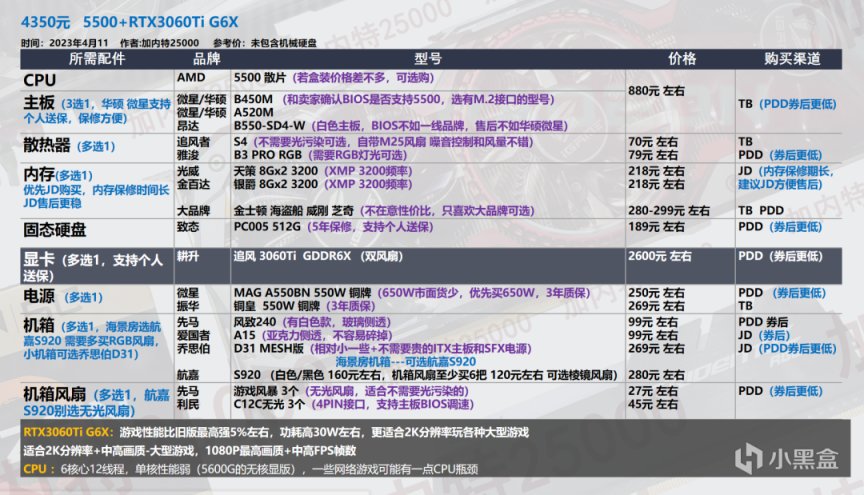 第一套配置,预算压到了不到4400元,AMD 5500网游性能略差,这套配置更适合玩3A 单机游戏为主。